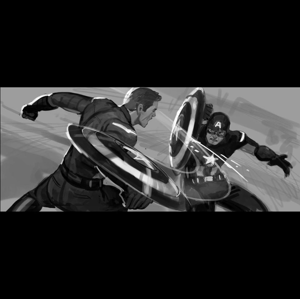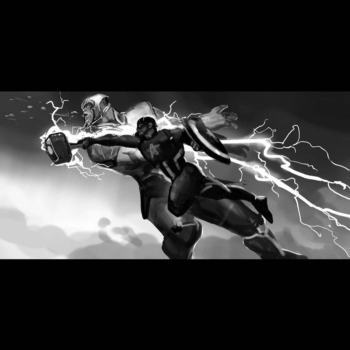 Пока Мейнердинг опубликовал три арта. На одном из них показана драка двух Стивов Роджерсов, на другом — Капитан Америка, наносящий Таносу удар Мьельниром. Кажется, эта сцена выглядит в фильме примерно так же, как на концепте Райана.