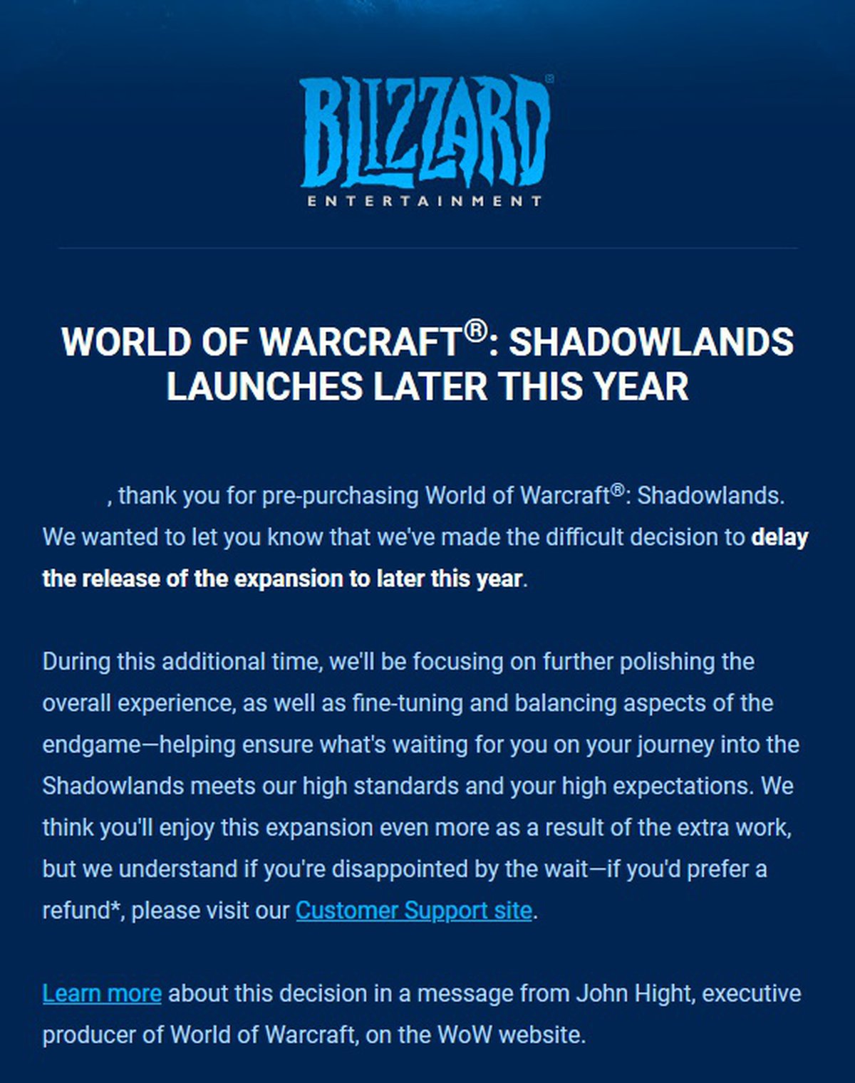 Дополнение World of Warcraft Shadowlands не выйдет 27 октября: за четыре недели до релиза аддон перенесли на неопределенный срок. Через несколько часов Blizzard разрешила оформлять возврат средств за предзаказы дополнения.
