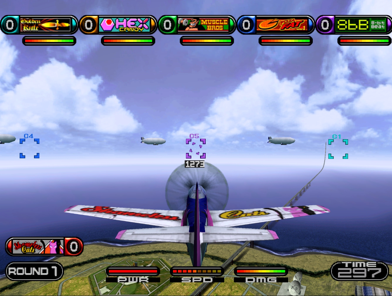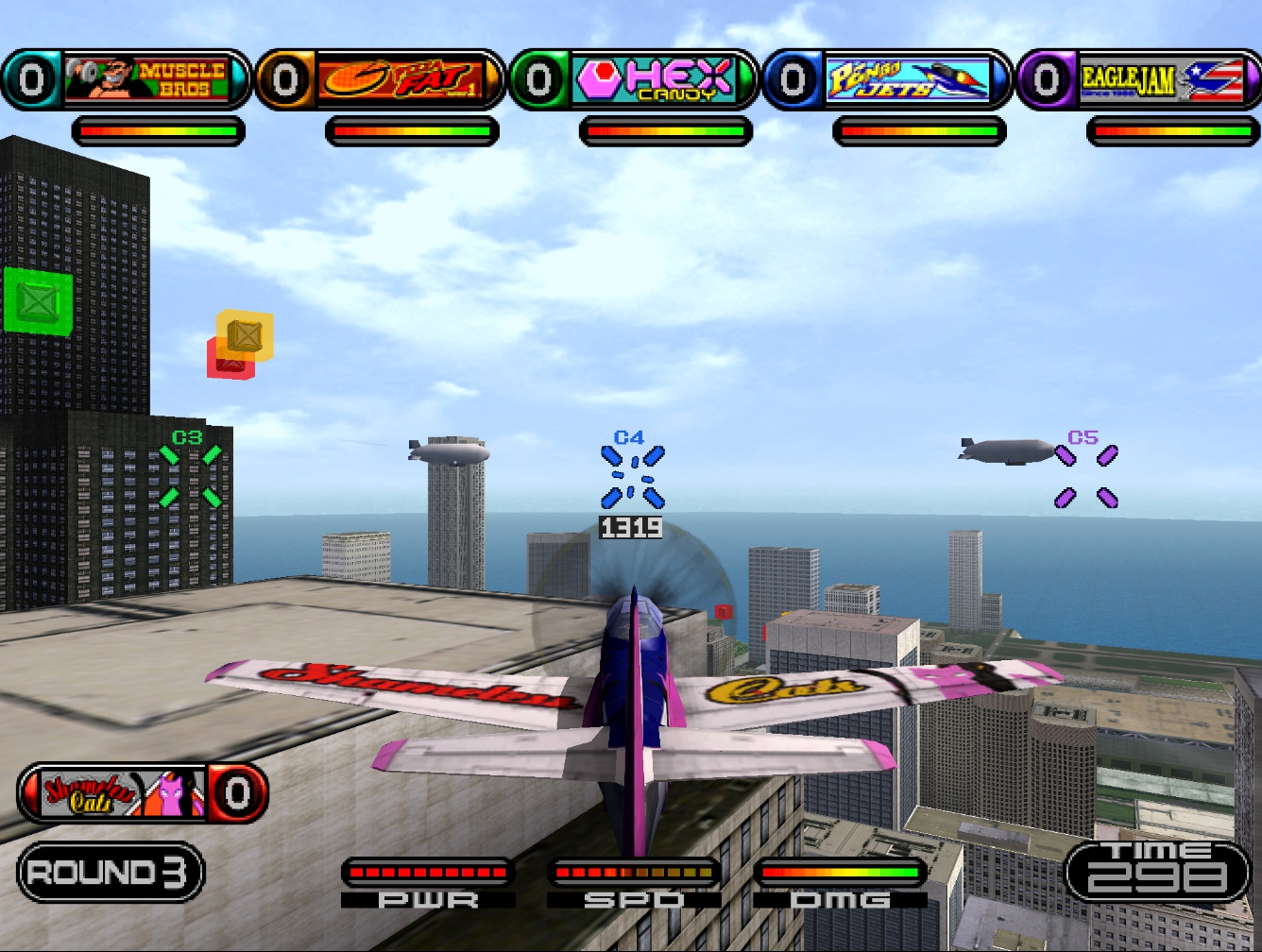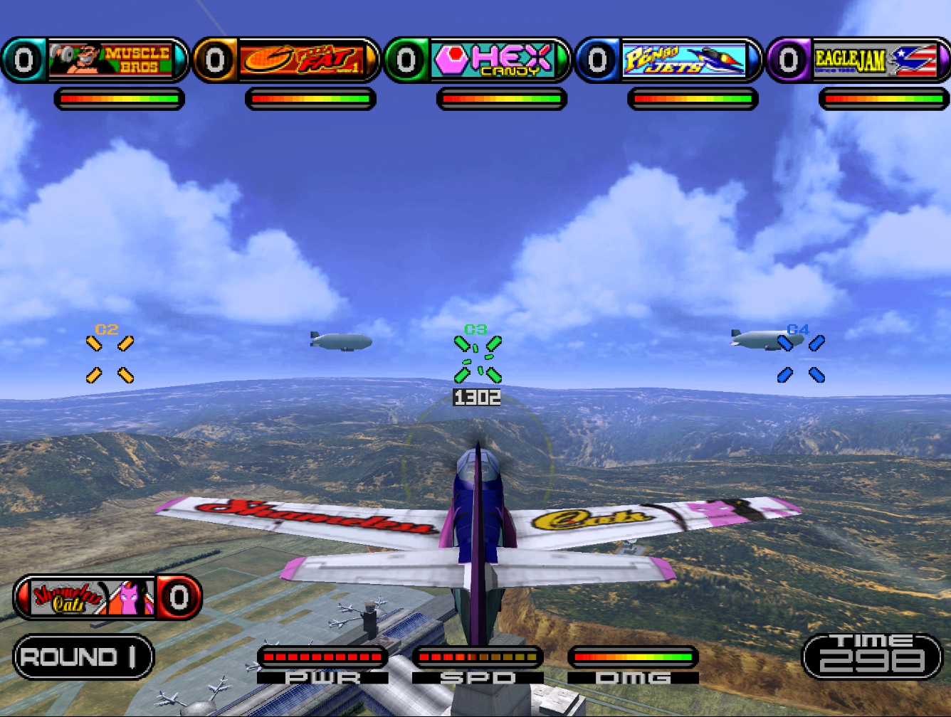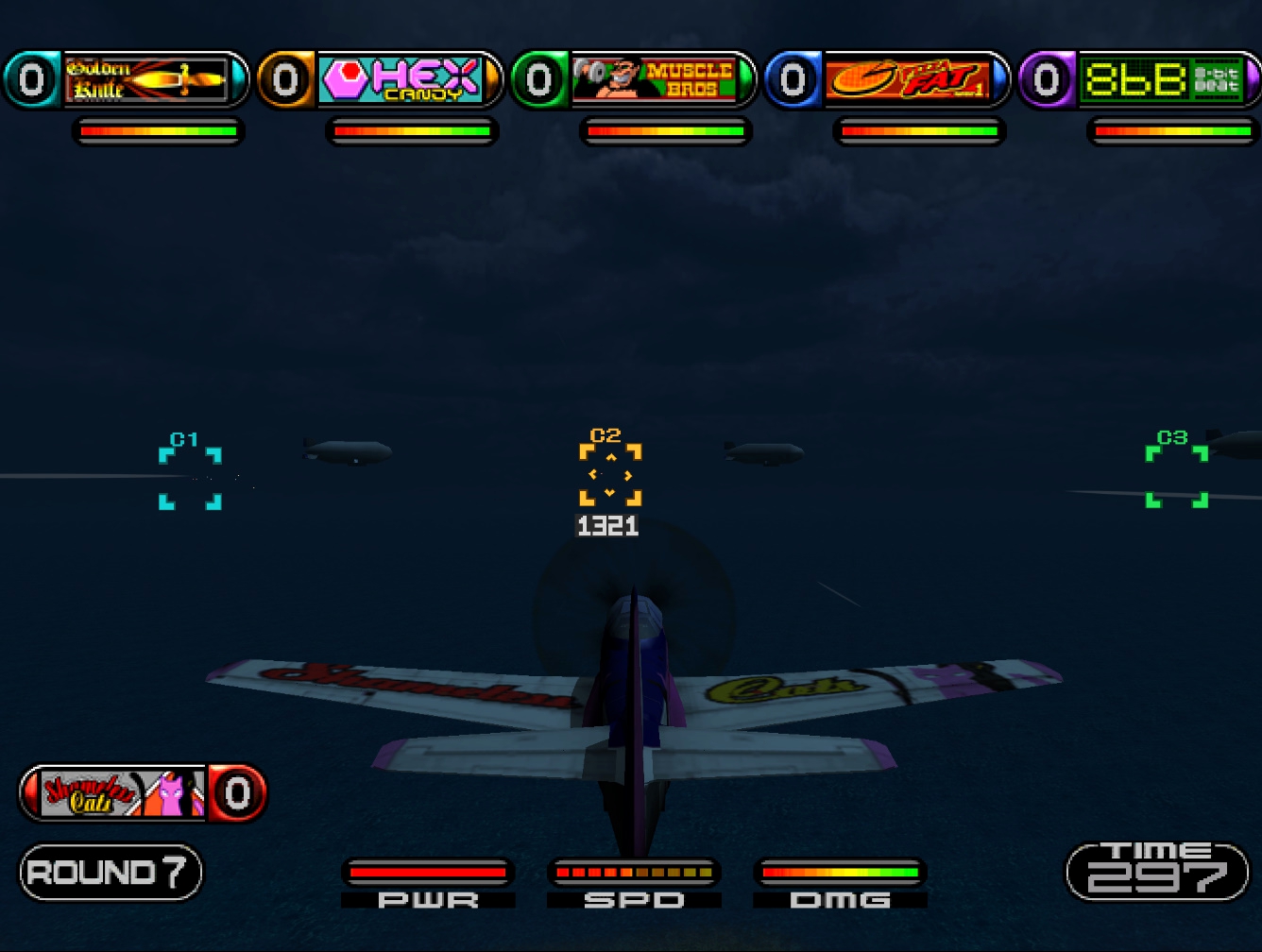 На выбор давались четыре персонажа и четыре арены. Задача игры до банального проста – взрывать самолёты противника до полного уничтожения команды. В боях задействованы не только реальные игроки, но и компьютер. Во время боя можно наблюдать за безтекстурным дирижаблем, а также собирать усиления и улучшения для самолёта через деревянные ящики, которые парят в воздухе. Когда самолёт уничтожается – пилот десантируется.