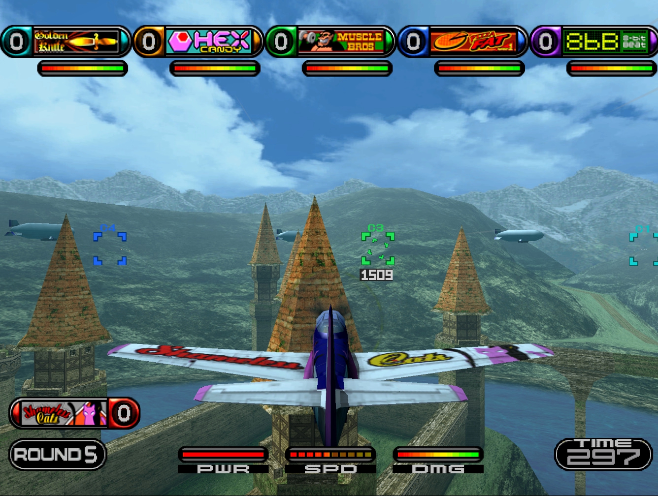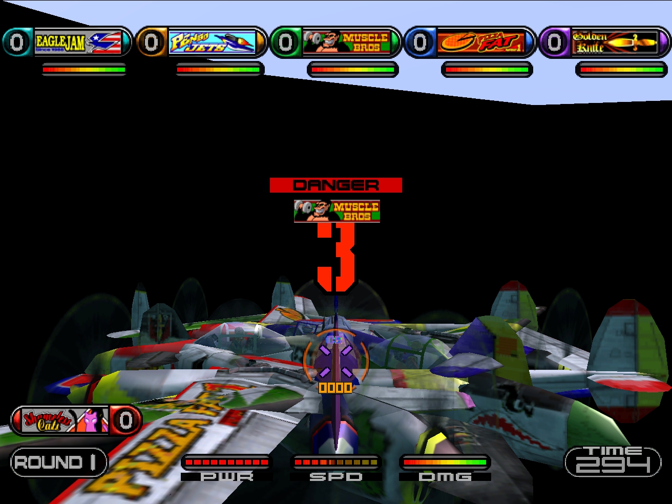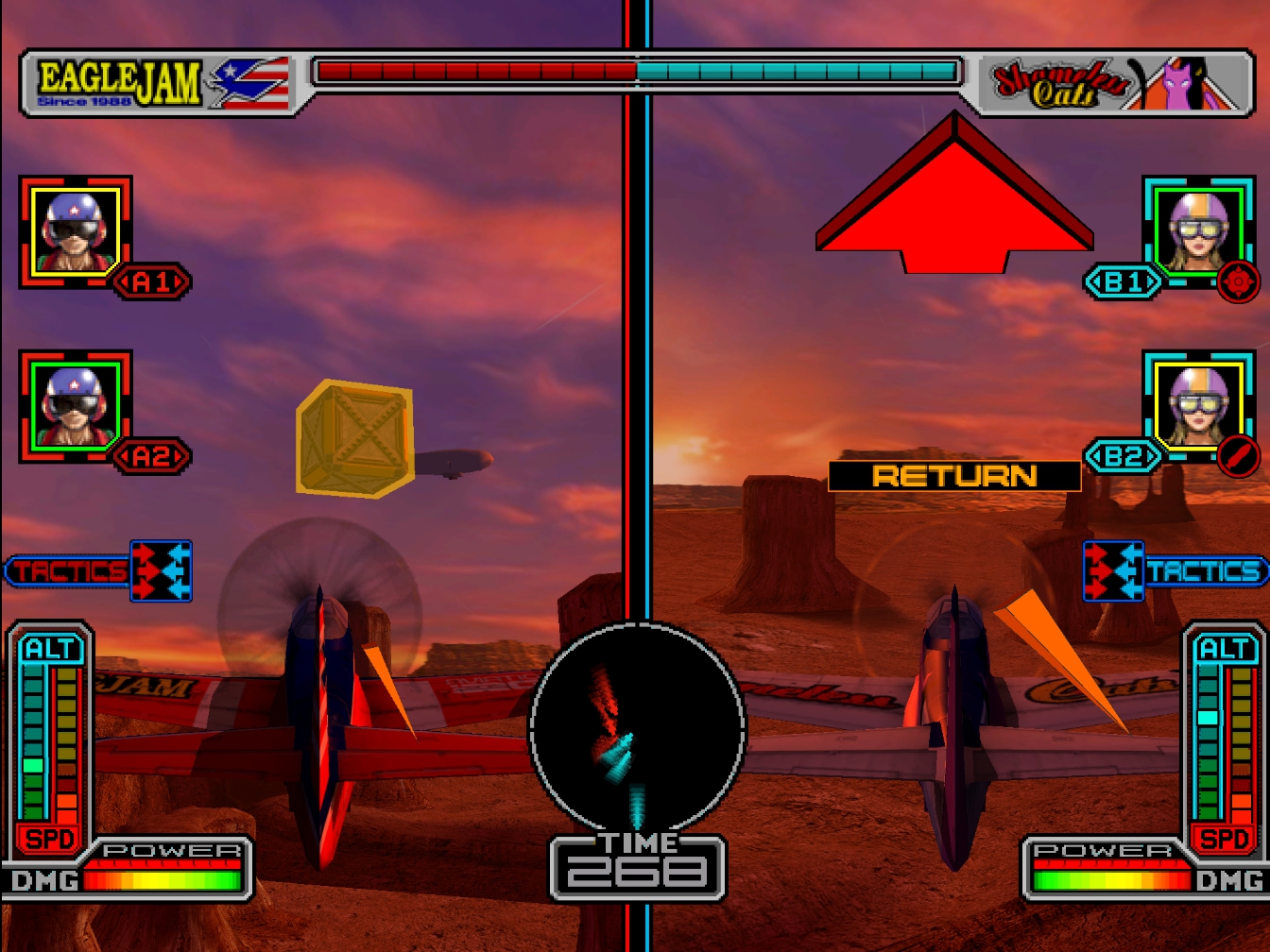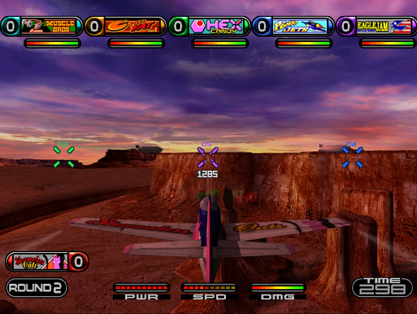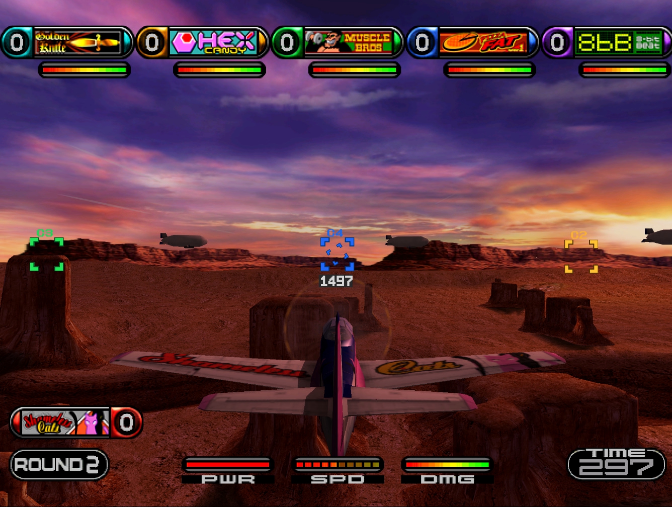 На выбор давались четыре персонажа и четыре арены. Задача игры до банального проста – взрывать самолёты противника до полного уничтожения команды. В боях задействованы не только реальные игроки, но и компьютер. Во время боя можно наблюдать за безтекстурным дирижаблем, а также собирать усиления и улучшения для самолёта через деревянные ящики, которые парят в воздухе. Когда самолёт уничтожается – пилот десантируется.