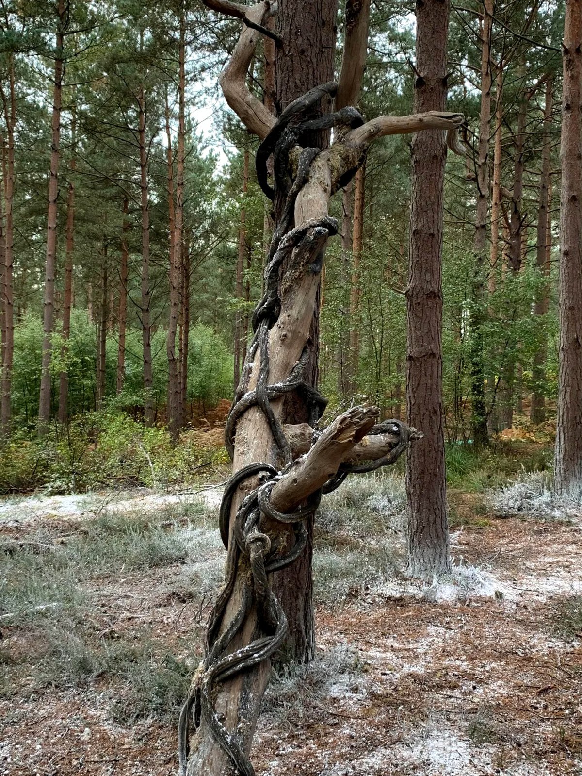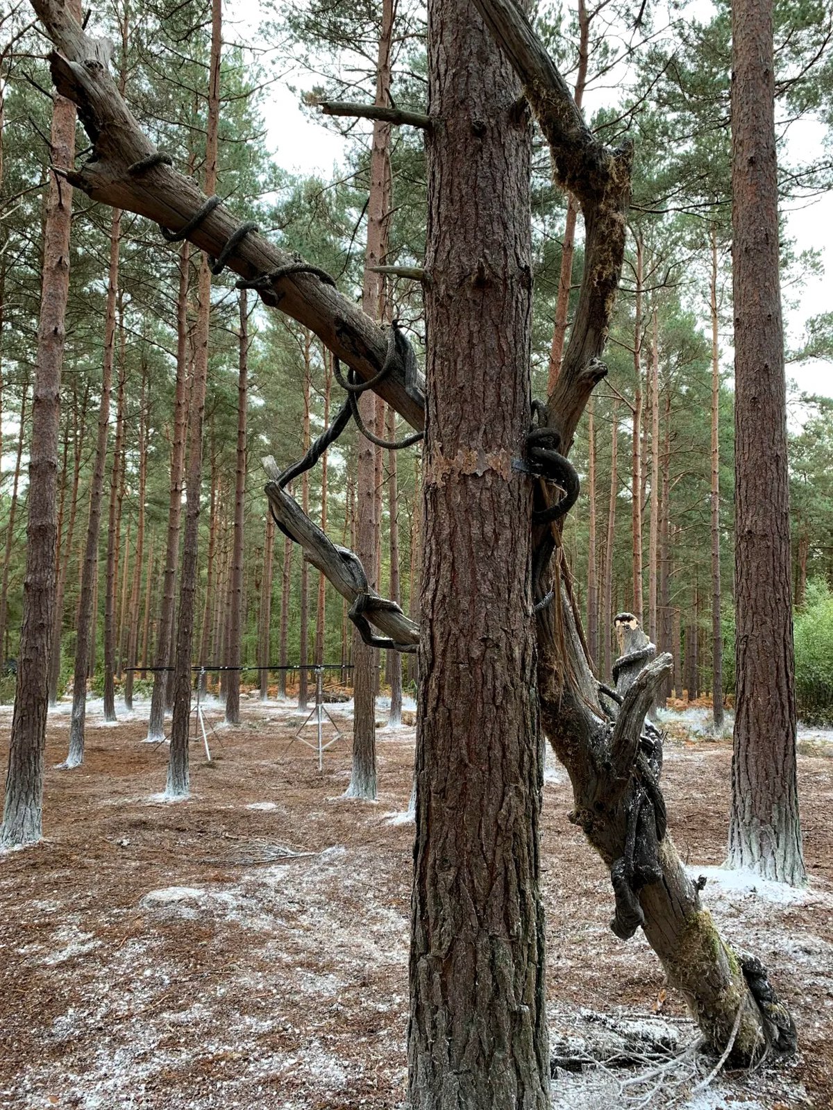 Судя по фотографиям, опубликованным местными жителями, в лесу начали появляться декорации. Съемочная группа расставляет необычные скалы, напоминающие монолиты, и деревья, причудливо заросшие толстыми лозами или лианами.