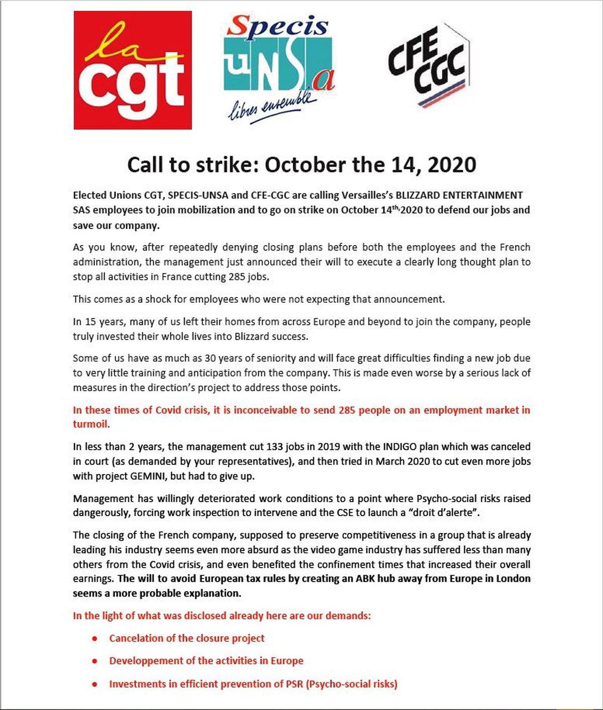 Французские профсоюзы GFE-CGC, SPECIS-UNSA и CGT призвали сотрудников местного подразделения Activision Blizzard выйти на забастовку. Таким образом они отреагировали на информацию о готовящемся закрытии французского офиса компании.