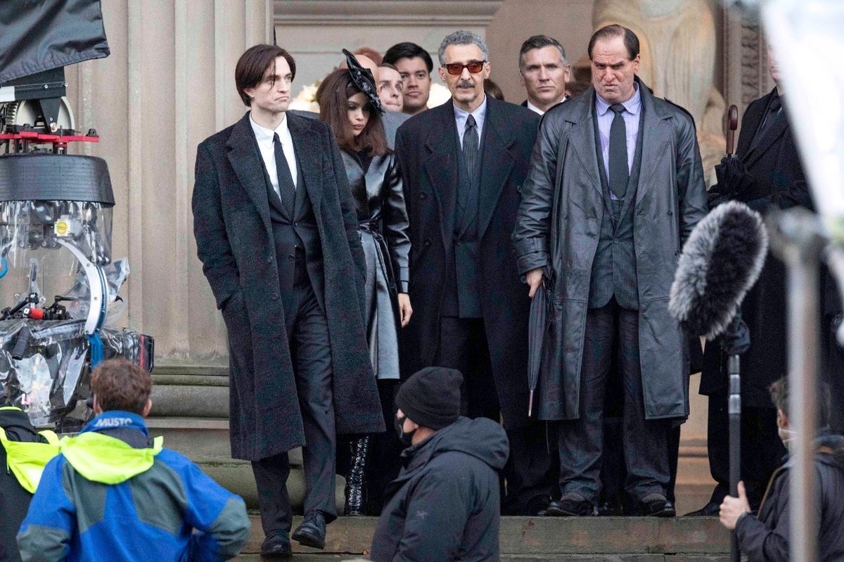 На еще одном кадре с площадки можно увидеть Брюса Уэйна в компании лидеров преступного мира Готэм-Сити. Этот кадр был сделан во время съемок похорон мэра города; рядом с Брюсом стоят Селина Кайл, Кармайн Фальконе и Пингвин.