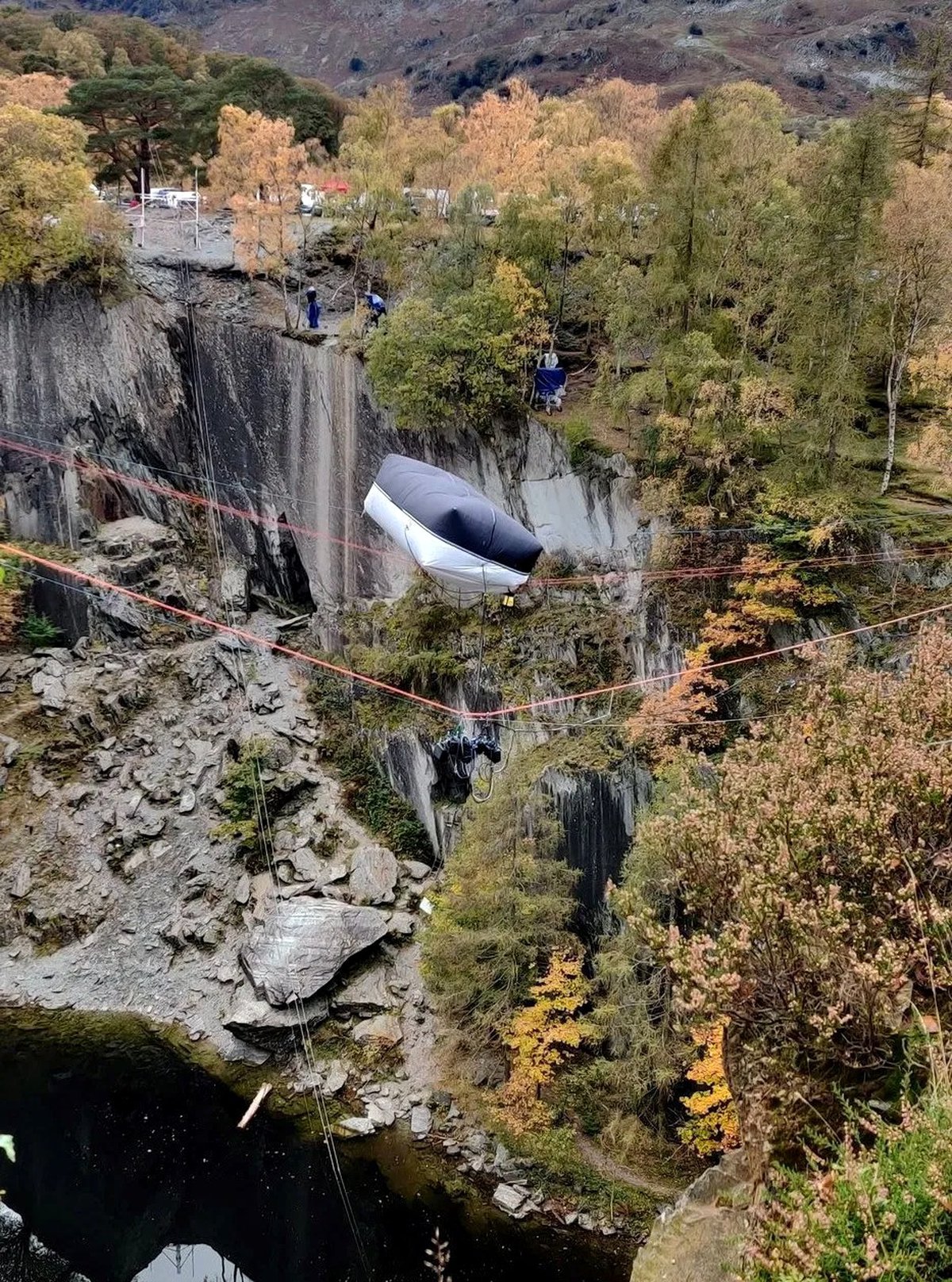 Съемки, видимо, будут вестись в разных точках карьера. Чтобы упростить работу, команда «Ведьмака» опутала карьер сетью тросов, по которым перемещается оборудование; огромный мешок в центре кадра наполнен газом и поддерживает камеру, снижая нагрузку на трос.