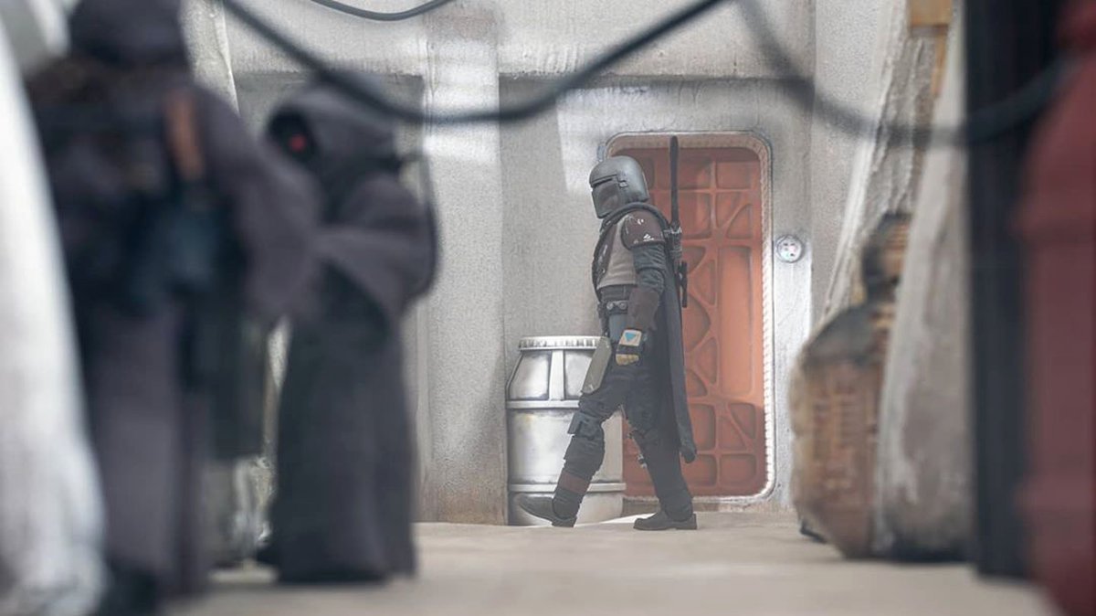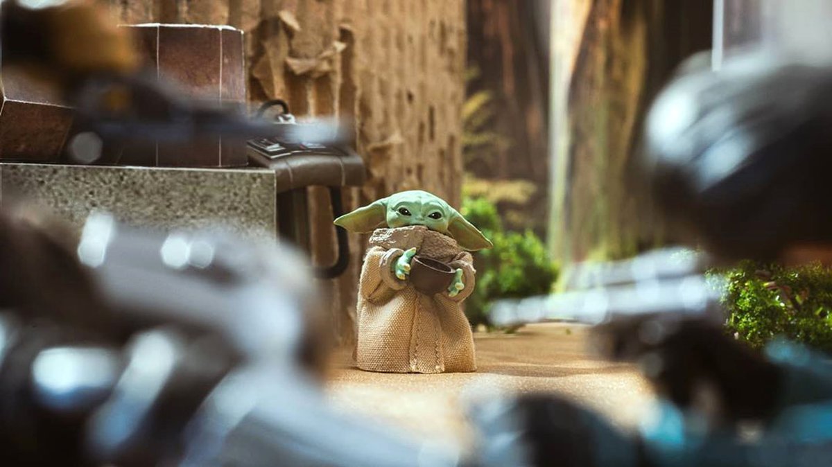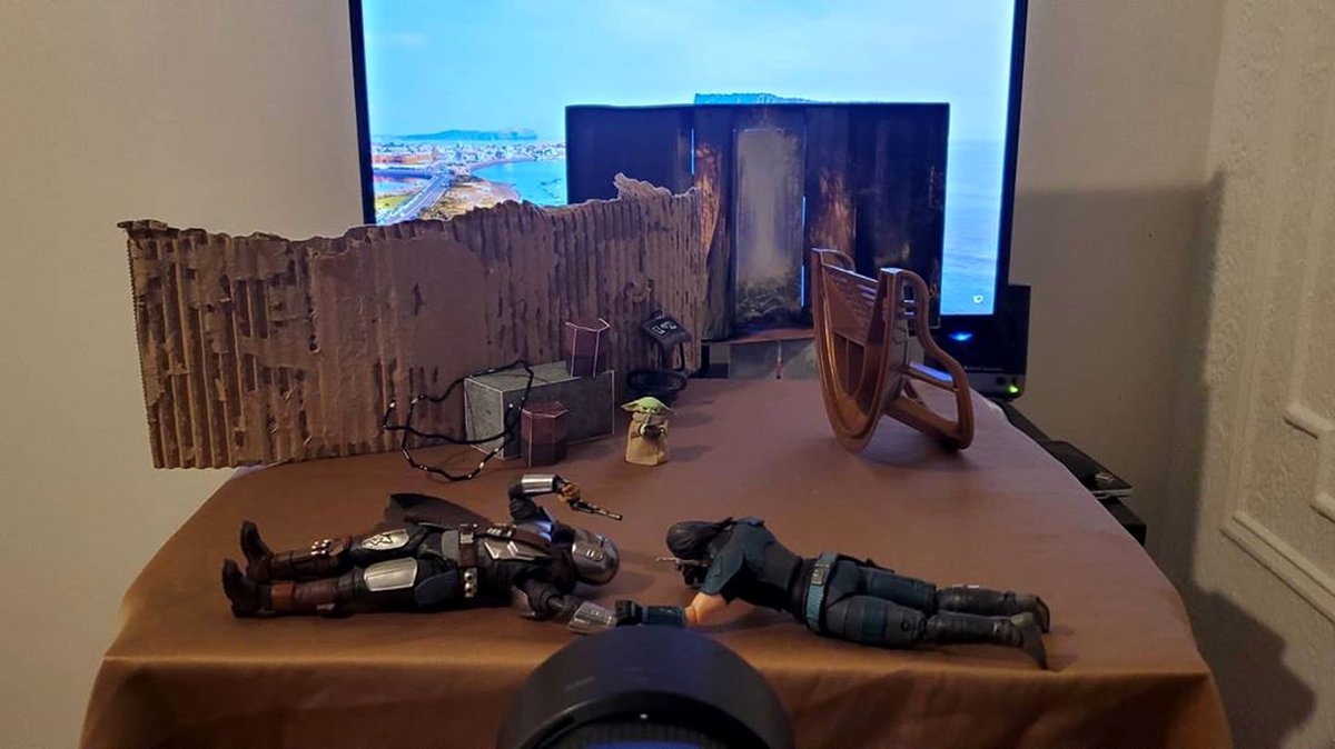 Например, кадр с малышом, следящим за сражением мандалорца и наемницы, снят на небольшом столе при помощи куска картонной коробки и буквально пары предметов.