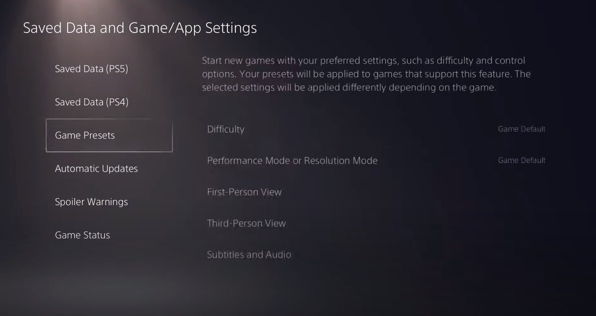 PlayStation 5 позволяет выставить настройки, которые автоматически будут применяться при запуске новой игры. Всего в интерфейсе описано пять типов настроек: сложность, режим рендеринга, звук и субтитры, вид от первого лица и вид от третьего лица.