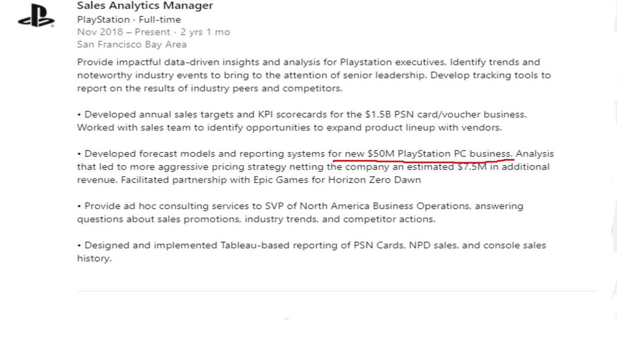 Аналитик игрового подразделения Sony Джерри Лю раскрыл выручку, полученную компанией благодаря играм для PC. Джерри опубликовал цифры в своем профиле LinkedIn; через некоторое время аналитик убрал данные, но игроки успели сделать скриншот.