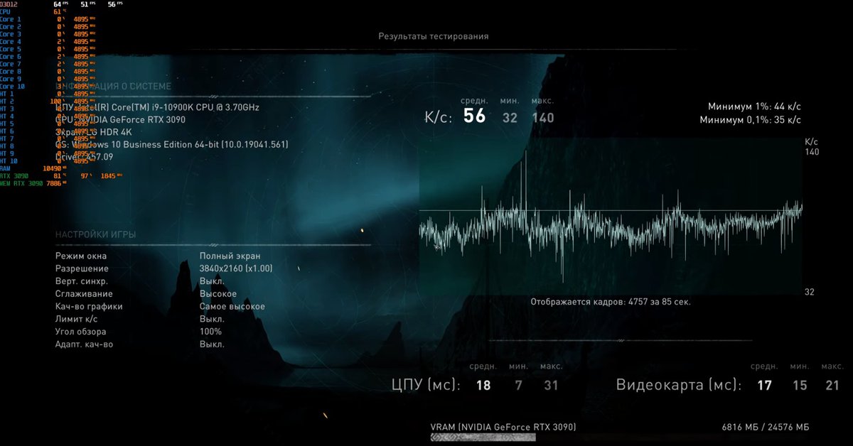 Интересно, что в разрешении 4К Assassin’s Creed Valhalla очень умеренно потребляла видеопамять. Из 24 гигабайт GeForce RTX 3090 было занято только 6816 мегабайт.