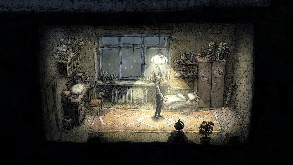 Есть у Amanita Design такая славная традиция, как бессловесный нарратив. И если рóботы Machinarium`a пользовались визуализацией мысли при помощи облаков, то персонажи Скрипов пользуются языком, но выдуманным. Как это помогает разгадывать повороты сюжета, попробуйте догадаться сами. Это если заглядывать немножко вперёд, а если не заглядывать, то вот у нас есть парень, читающий книгу у себя в квартире и больше нам ничего про него не известно. Даже имя – Яков, мне пришлось придумать самому. Ни одного знакомого Якова у меня ещё не было и это показалось хорошим аргументом за.