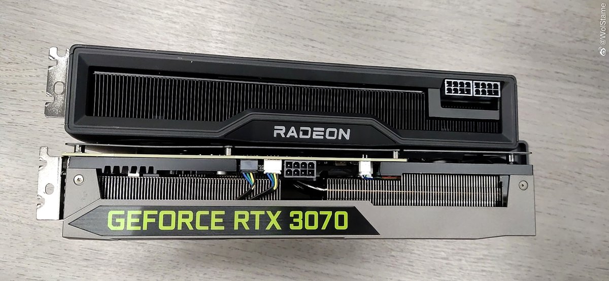 В китайской социальной сети Weibo опубликовали фотографии видеокарты Radeon RX 6800 XT вместе с одним из конкурентов, GeForce RTX 3070. Размеры карт практически идентичны.