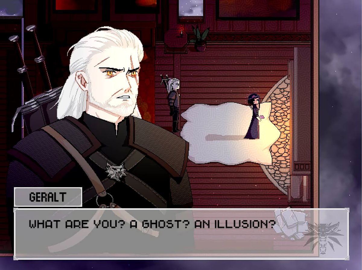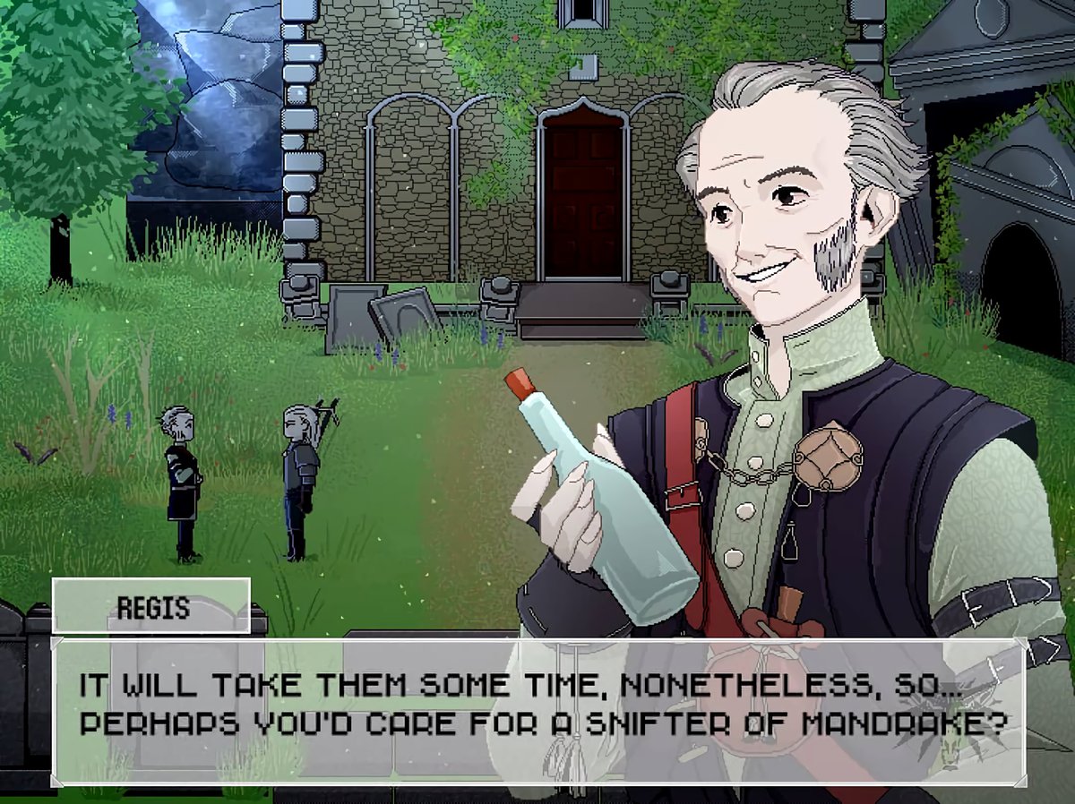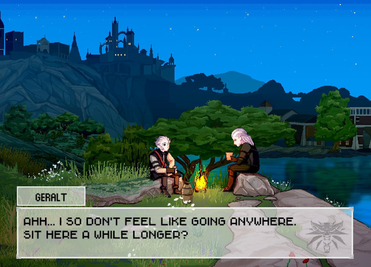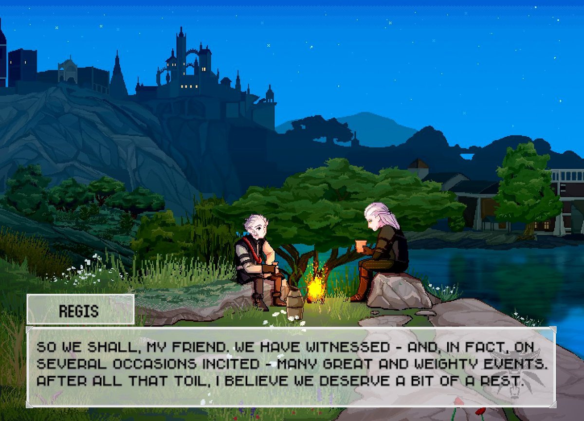 Свои арты dantevinchester стилизовал так, чтобы они напоминали реальную игру, сделанную в RPG Maker. Художник даже создал небольшую анимированную сцену на основе кадров с отдыхающими Геральтом и Регисом — получилось довольно атмосферно.