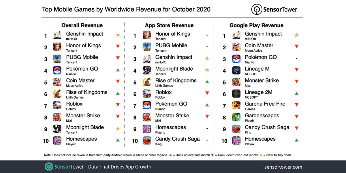 Genshin Impact удалось возглавить глобальный топ самых доходных проектов. Следом за ней идут Honor of Kings, PUBG Mobile, Pokemon Go и Coin Master. Для сравнения: занявшая второе место Honor of Kings заработала порядка $225 миллионов.