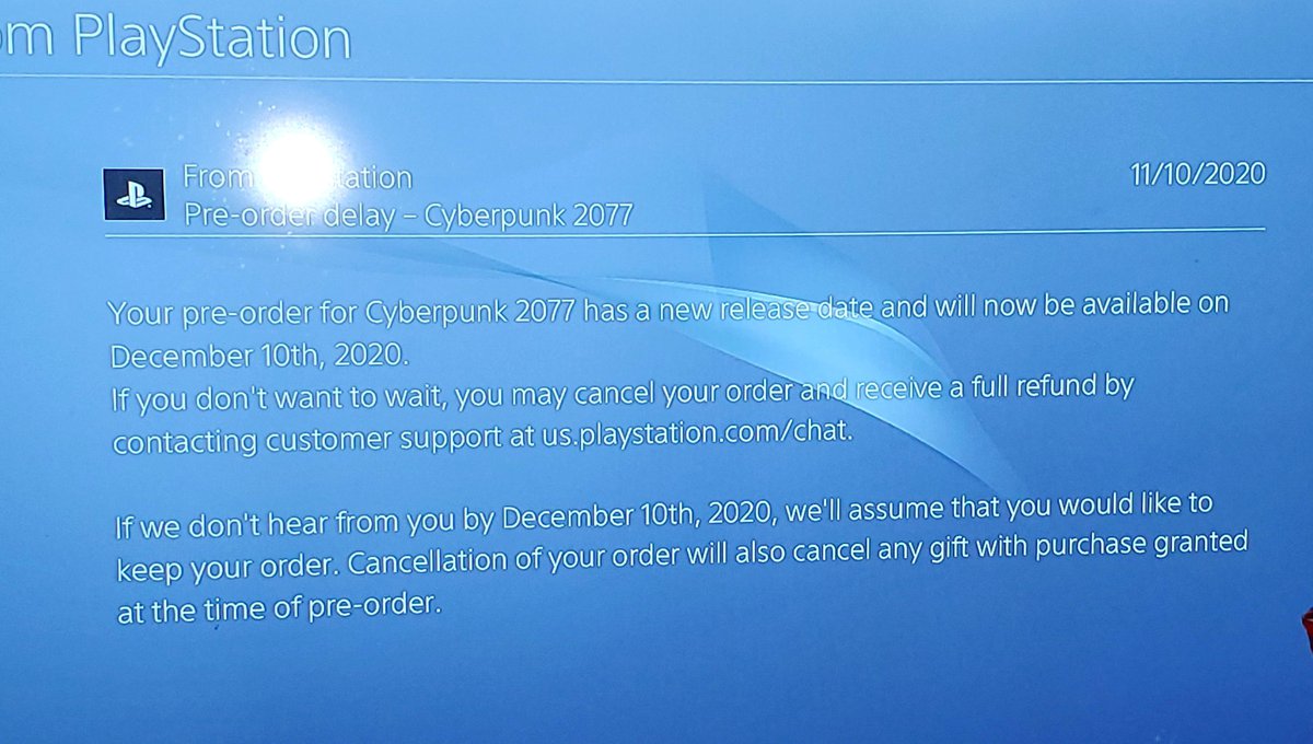 Игровое подразделение Sony организовало массовую рассылку сообщений с предложением отменить предзаказ Cyberpunk 2077. Компания объясняет такое предложение изменением даты выхода игры с 19 ноября на 10 декабря.