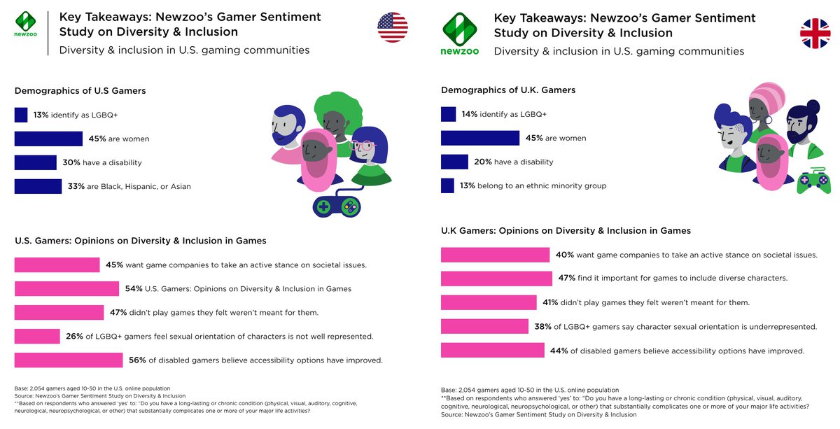 Исследовательская компания Newzoo провела среди британских и американских игроков опрос, посвященный инклюзивности и разнообразию героев игр. Примерно половина опрошенных игроков в каждой из стран высказалась за более инклюзивные игры.