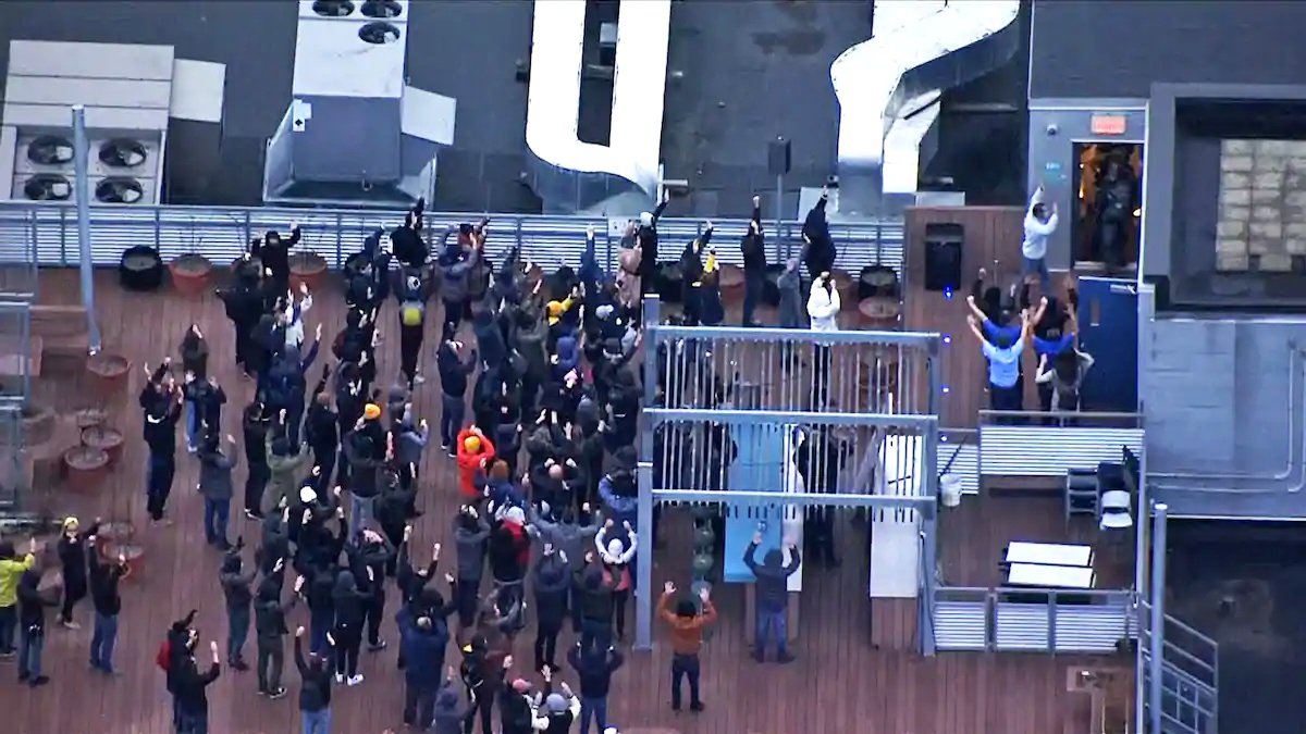 Полиция появляется на крыше офиса, все поднимают руки вверх