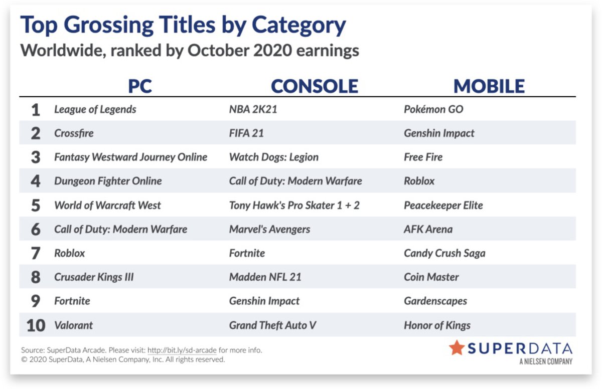 Самой прибыльной игрой октября аналитики называют Genshin Impact, не возглавившую ни один из платформенных чартов. Примерная выручка в отчете не приводится.