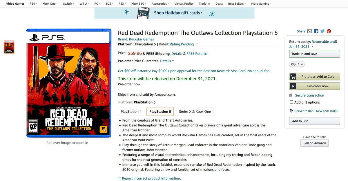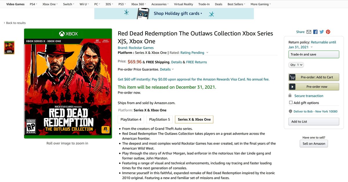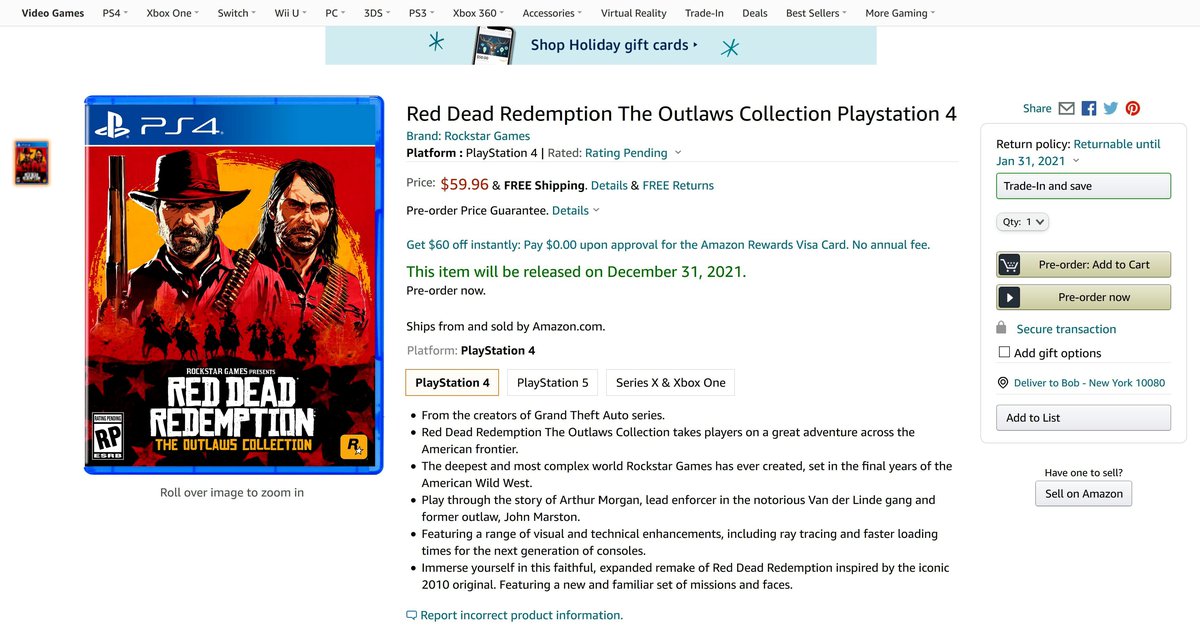 Сборник планируется выпустить на двух поколениях консолей, у него есть версии для PlayStation 4, PlayStation 5, Xbox One и Xbox Series. Видимо, одновременно с релизом у Red Dead Redemption 2 появится версия с поддержкой консолей нового поколения.