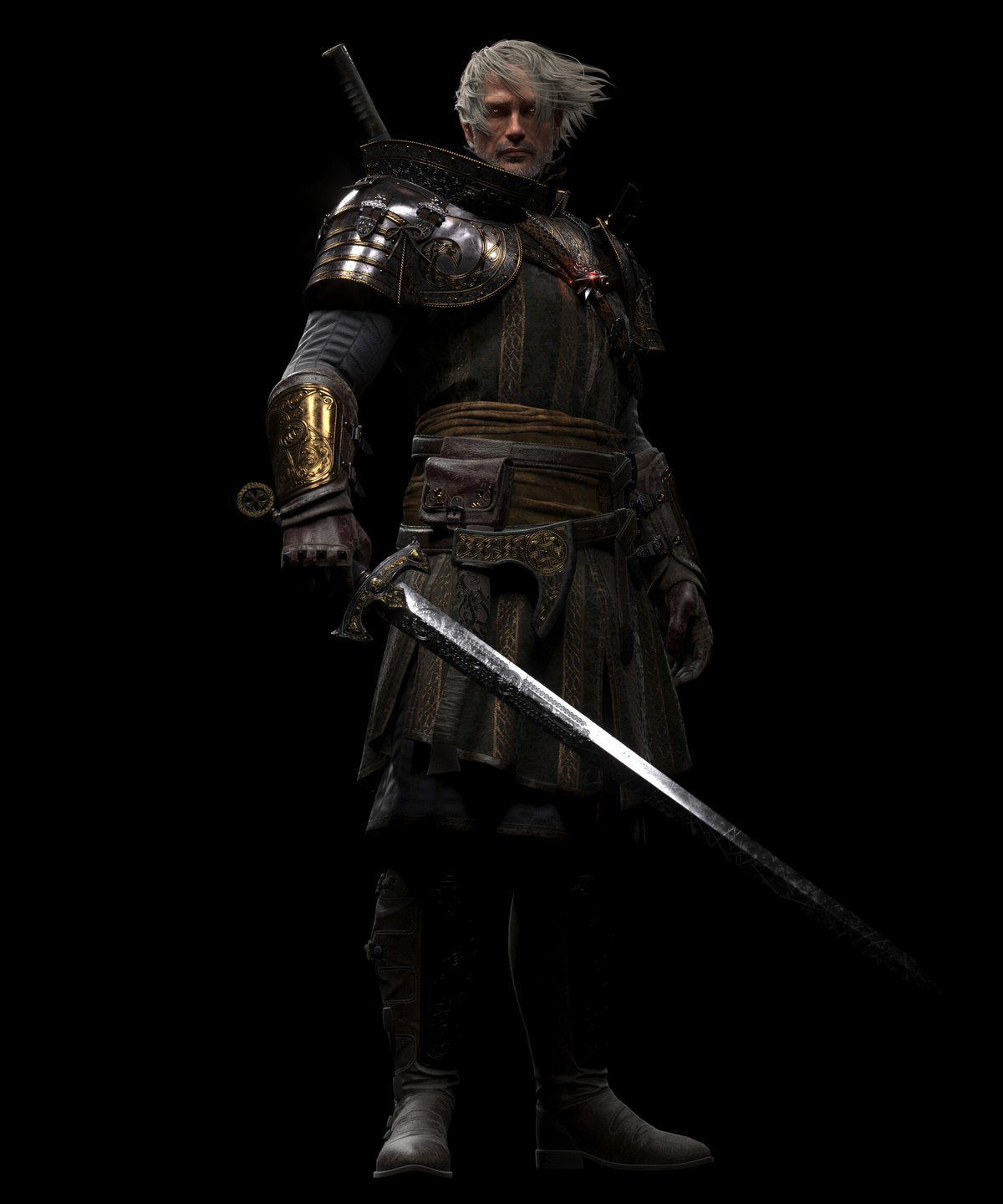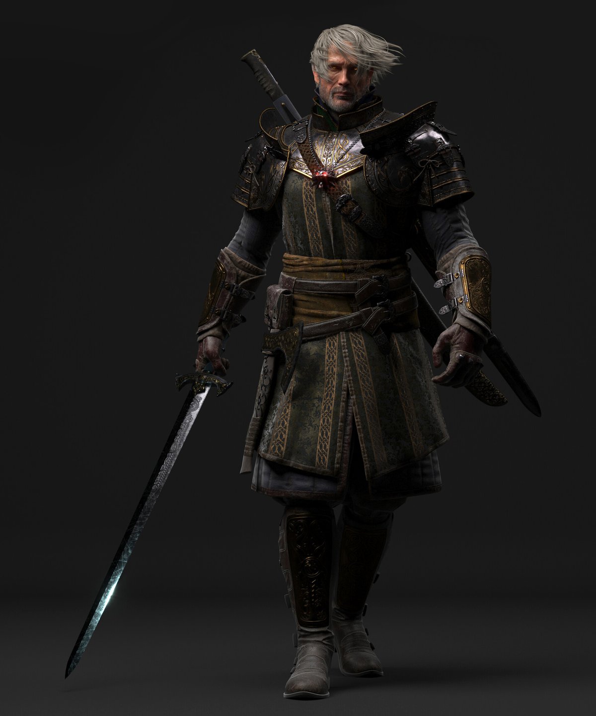 Вышло отлично, но с тяжестью доспехов художник, кажется, переборщил. Броня выглядит так, словно Вонки Чо вдохновлялся снаряжением школы Медведя, но по тяжести и богатству снаряжение Геральта-Миккельсена больше подошло бы кому-то из персонажей Final Fantasy.