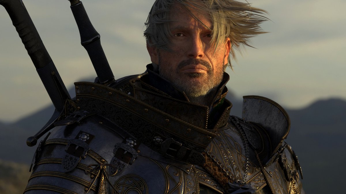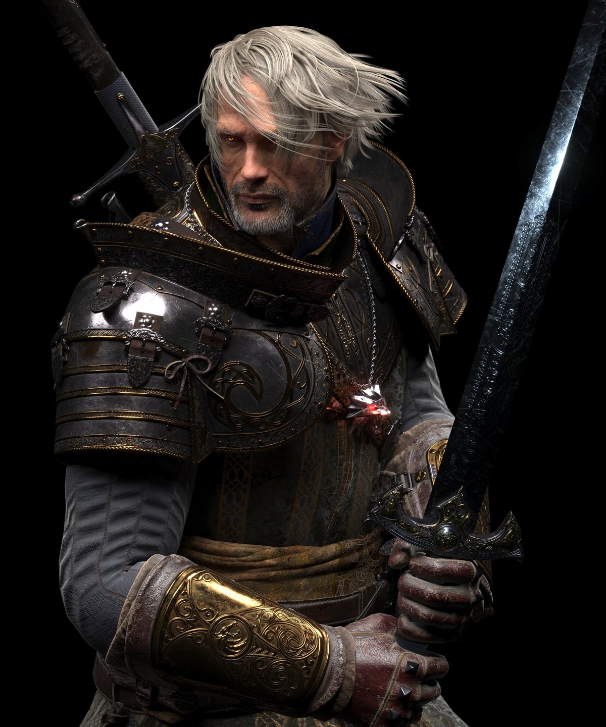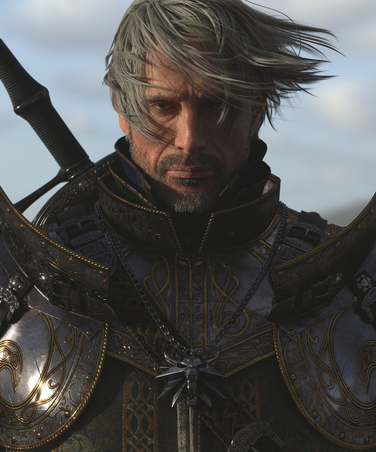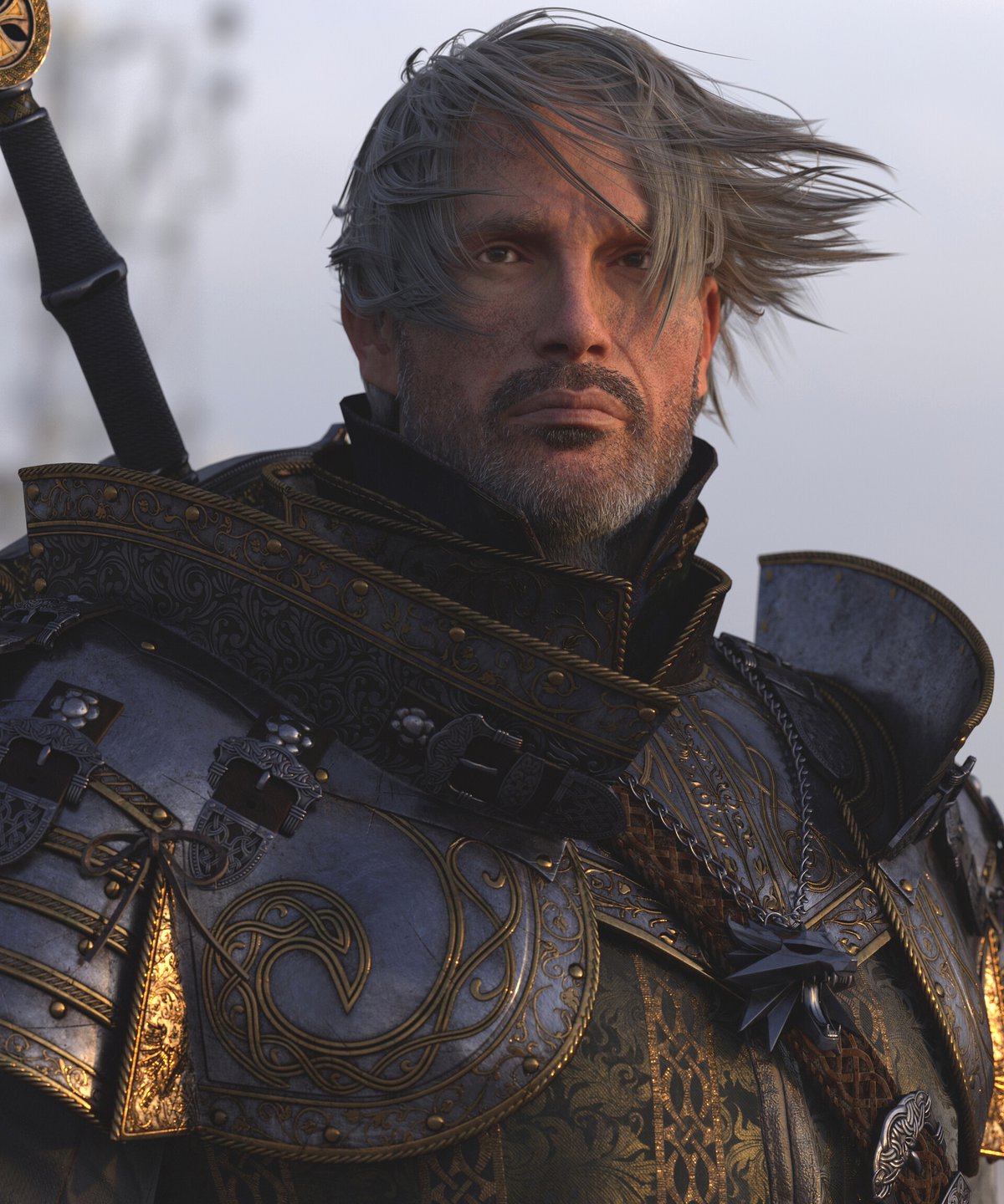 Мадс Миккельсен — обязательный участник фанатских рейтингов актеров, которым стоило бы сыграть ведьмака Геральта. Сеульский 3D-художник Вонки Чо изобразил Миккельсена в образе Геральта, одновременно слегка омолодив актера.