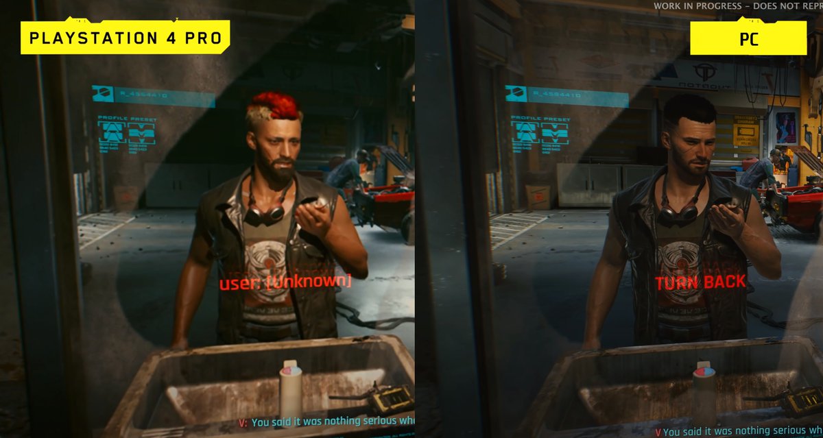 Основное отличие между версиями Cyberpunk 2077 для PlayStation 4 Pro и PC — разрешение рендеринга. По сравнению с PC картинка на консоли выглядит достаточно мыльной. Кроме того, разработчики снизили разрешение некоторых эффектов.