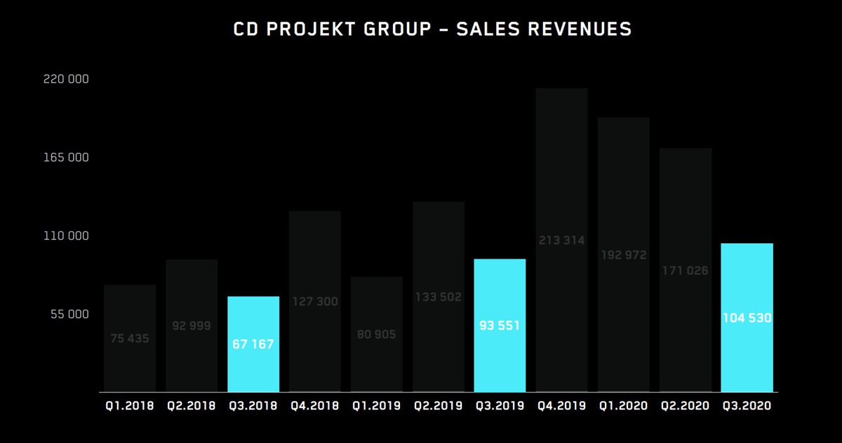Холдинг CD Projekt выпустил отчет за третий квартал 2020 финансового года — у компании он соответствует календарному году и закончился 30 сентября. По сравнению с прошлым годом выручка компании увеличилась на 13%, до $27.7 миллиона.