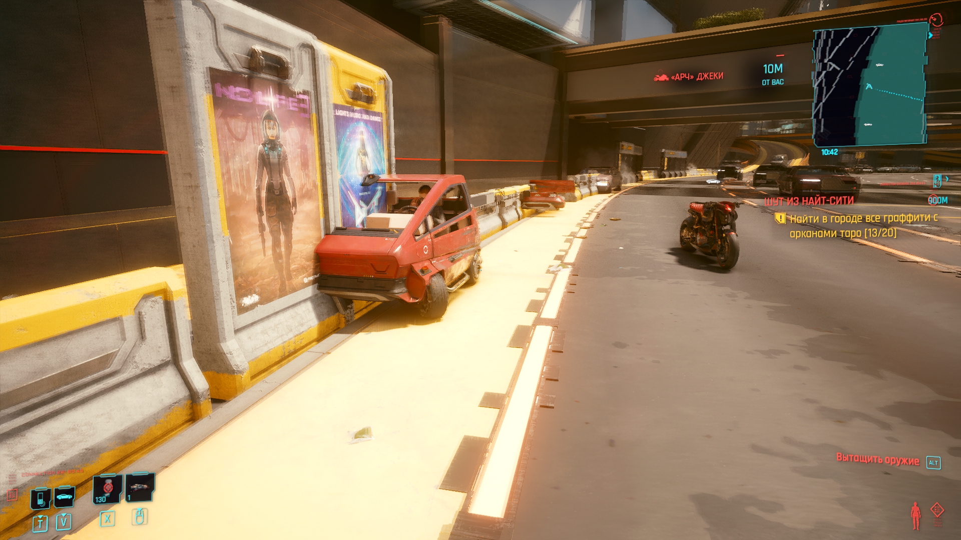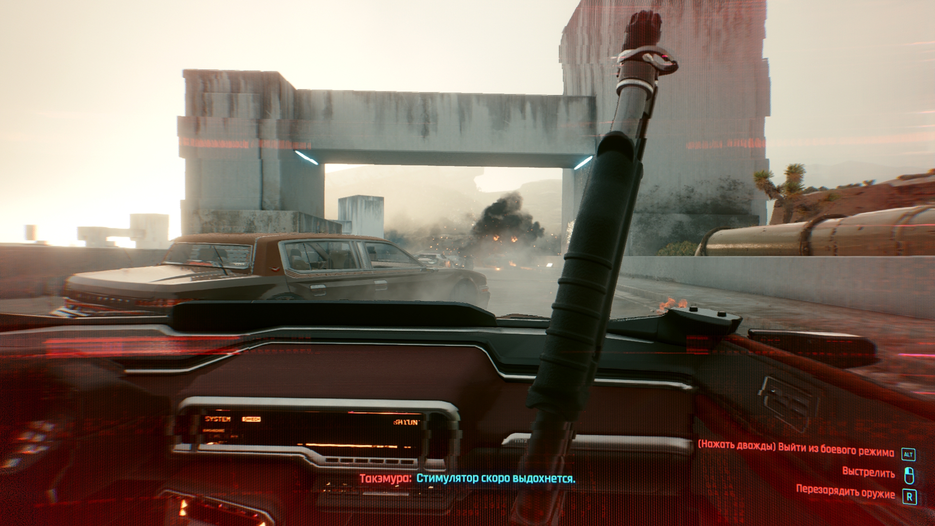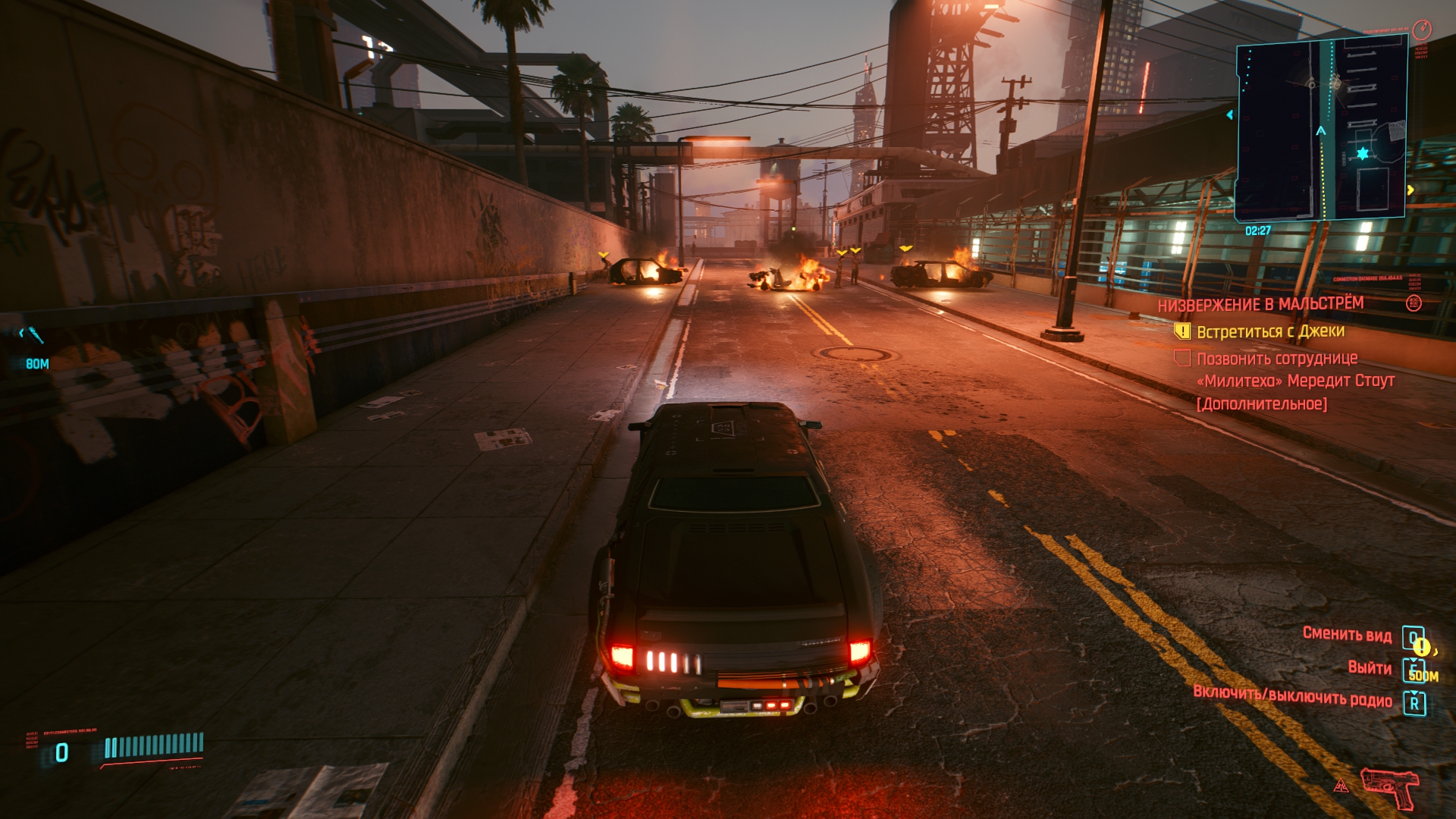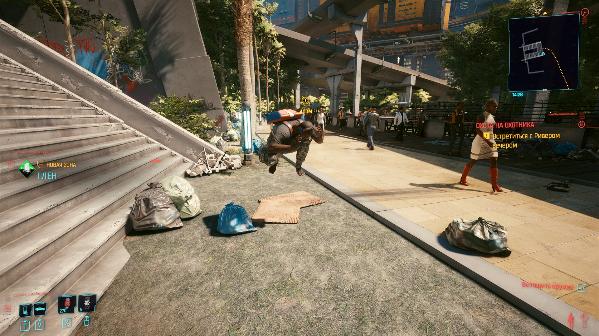 Ух, даже не знаю с чего начать. Попробуем для разнообразия с чего-то позитивного. Графика, она в игре хорошая, общие виды города, персонажи, оружие и одежда выглядят отлично, тут не доебешься. Хотя, все это выглядит отлично, пока игра не багует. И.е. где-то 30% времени. Замечу, я говорю именно про работу художников, те же анимации или физика одежды — стыд и позор. В 2020 не сделать хотя бы простенькую анимацию у пальто ещё постараться надо. Да и если честно, считать это за плюс максимально странно, когда каждый год выходит игра, которая поражает своей графикой. Так и тут, с выходом нового МЕ или Драгон Аге, киберпанк скорее всего конкуренции не выдержит.