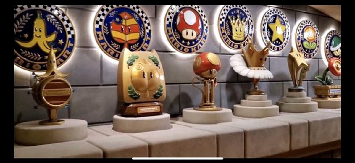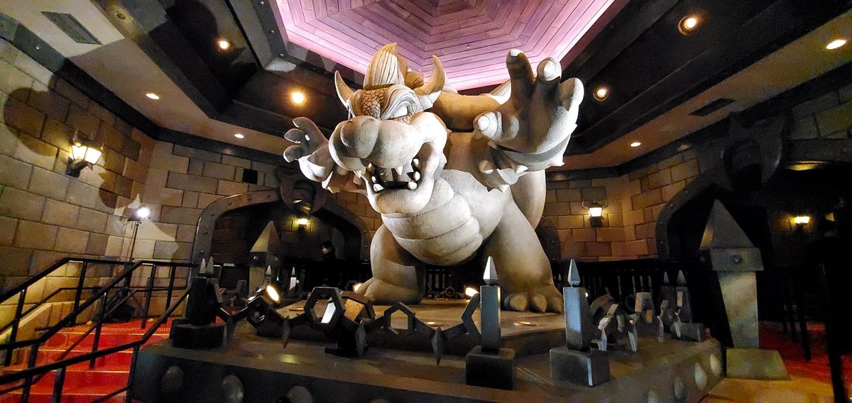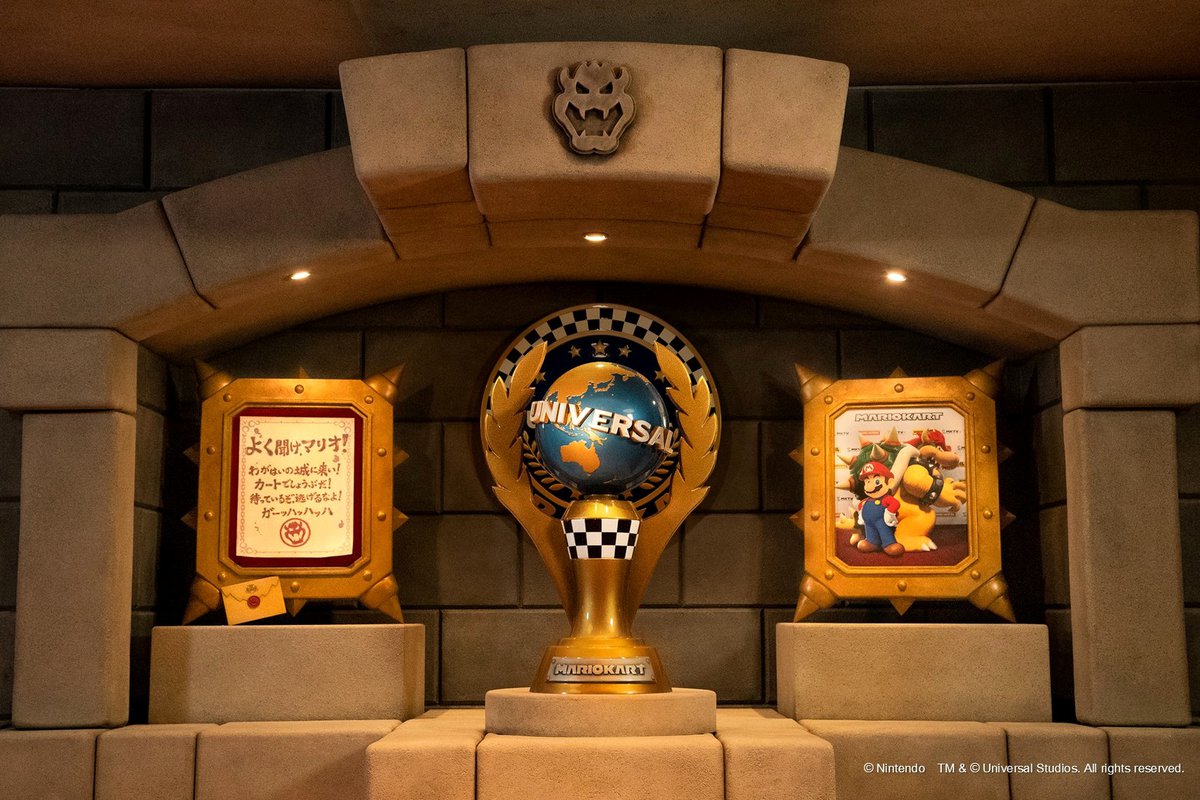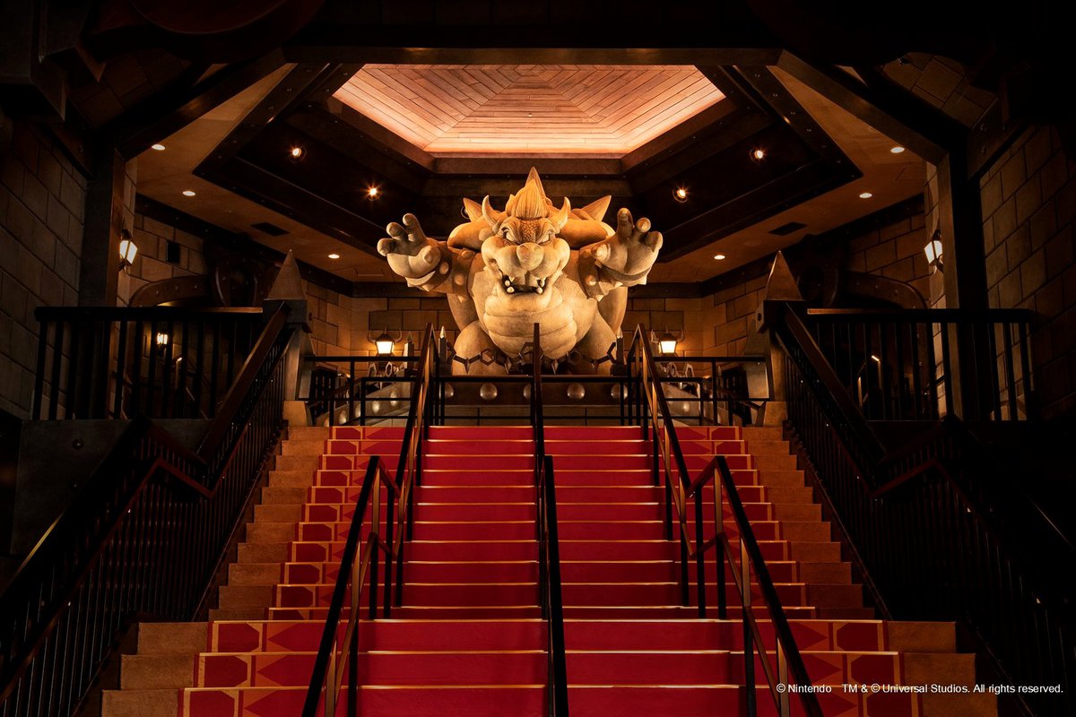 - Сам аттракцион находится внутри замка Боузера, где выставлена гигантская статуя противника Марио и многочисленные трофеи.