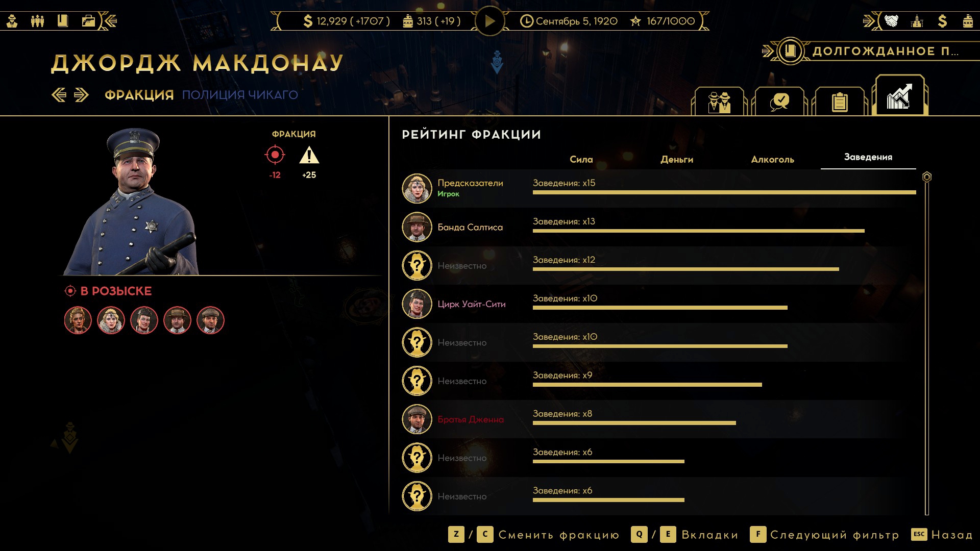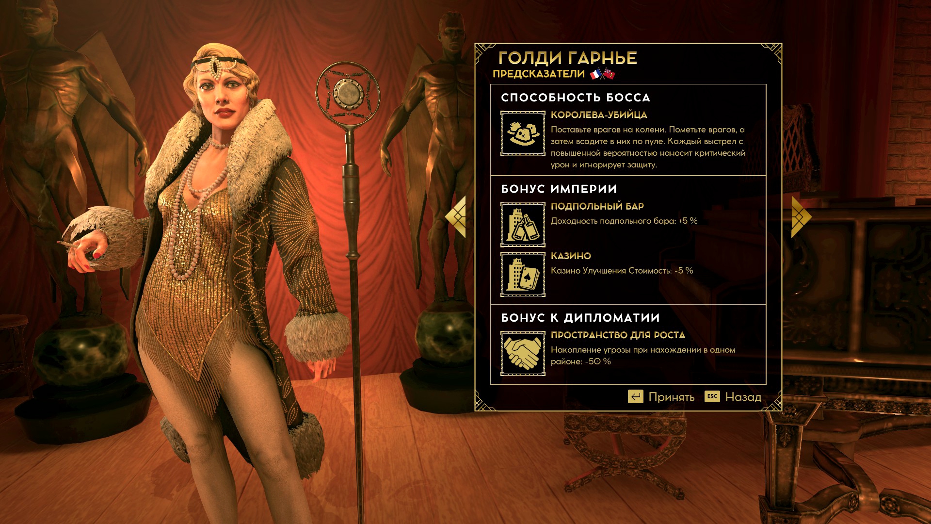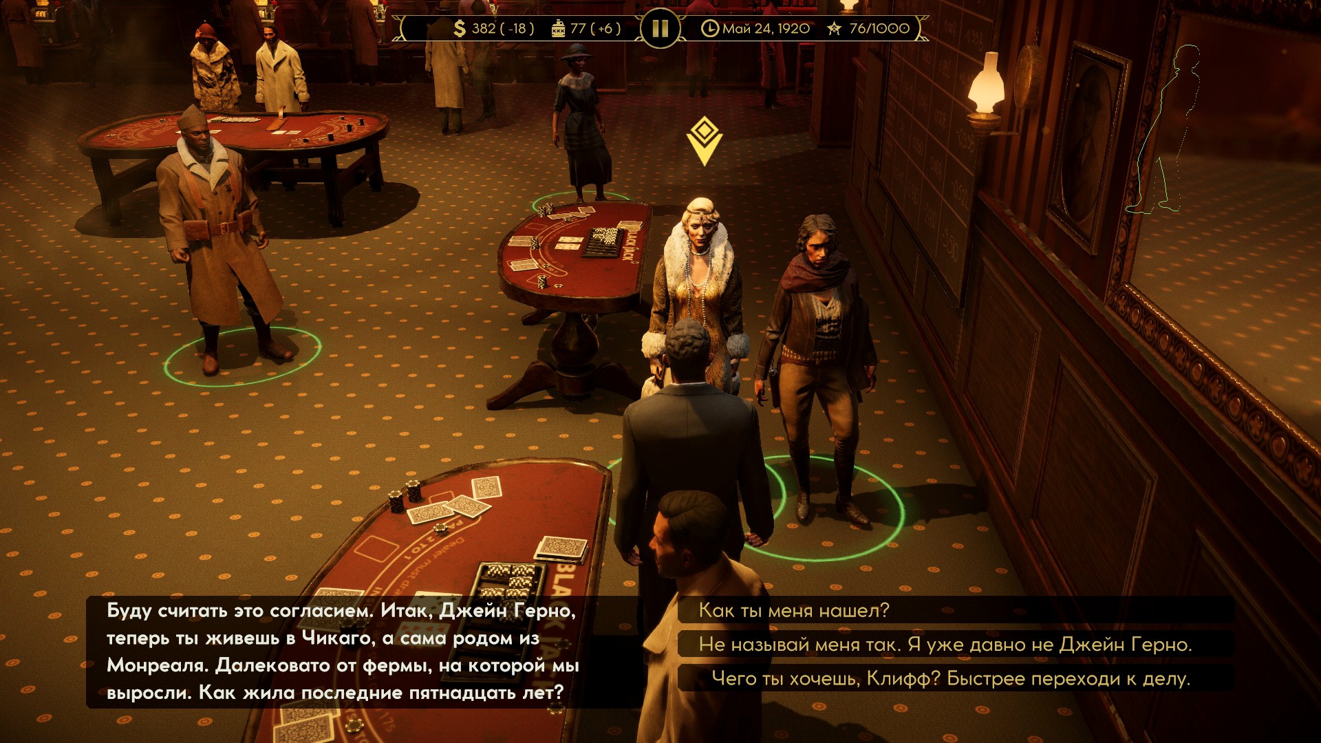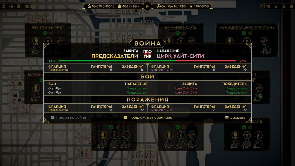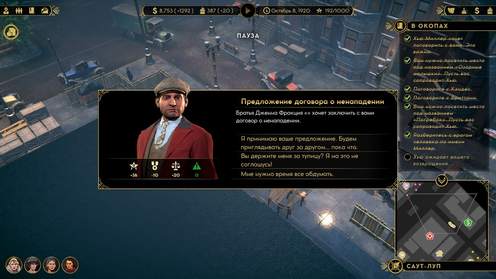 Соглашения предлагается всего одно. Обмен экономическими бонусами. Например, моя блондинка повышает популярность всех баров на 5%, и другой босс попросит поделится эффектом, предлагая взамен свои условные -5% к содержанию казино. Вот только этот стартовый бонус никак не увеличивается у самого персонажа. Да, у нанятых гангстеров бывают черты, помогающие бизнесу, и помогающие на 10%. Так зачем нам несущественный договор с заведомо враждебной фракцией? Игра прямо говорит, что это не Crusader Kings, а королевская битва. В конце выживет лишь один.