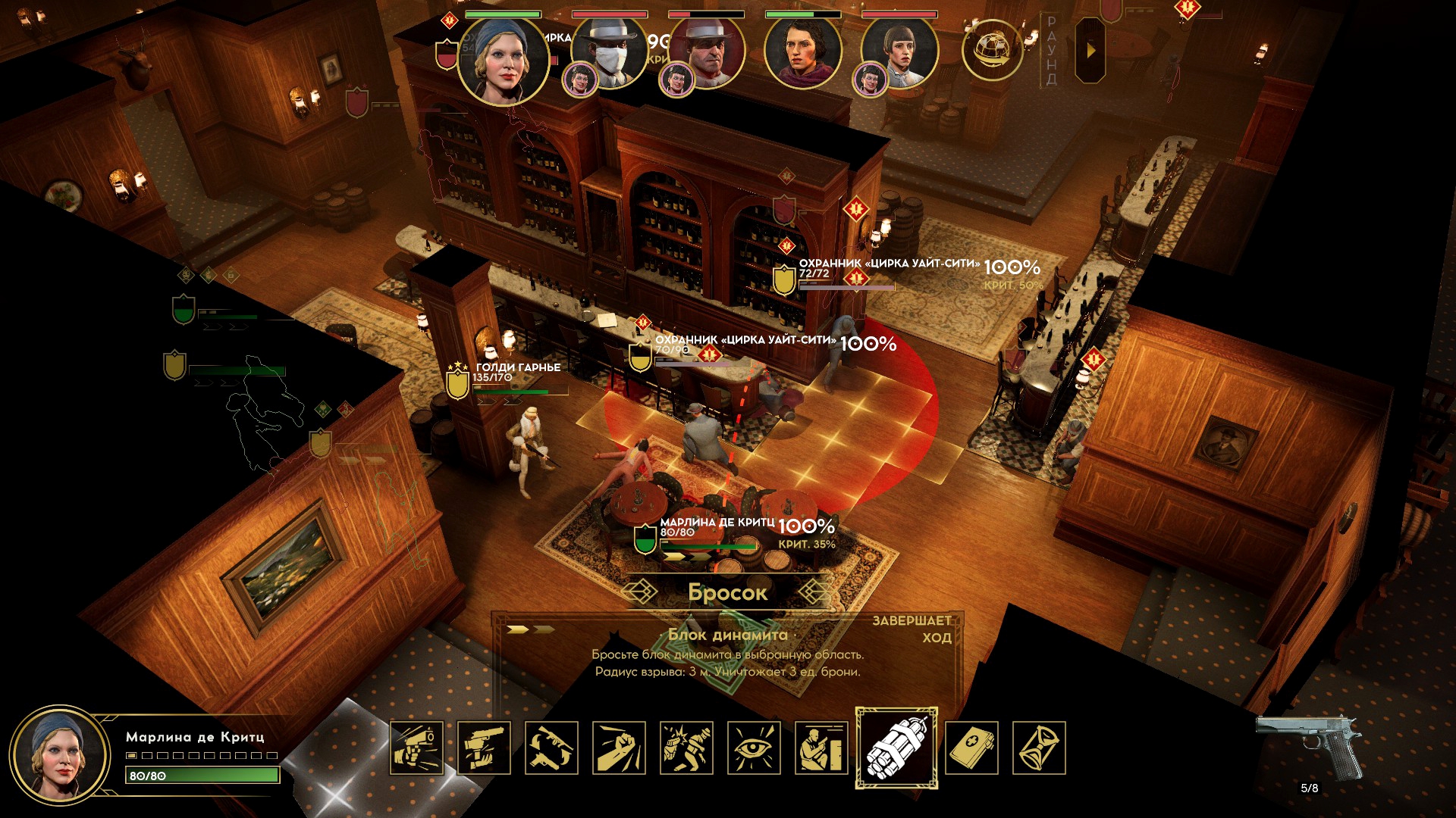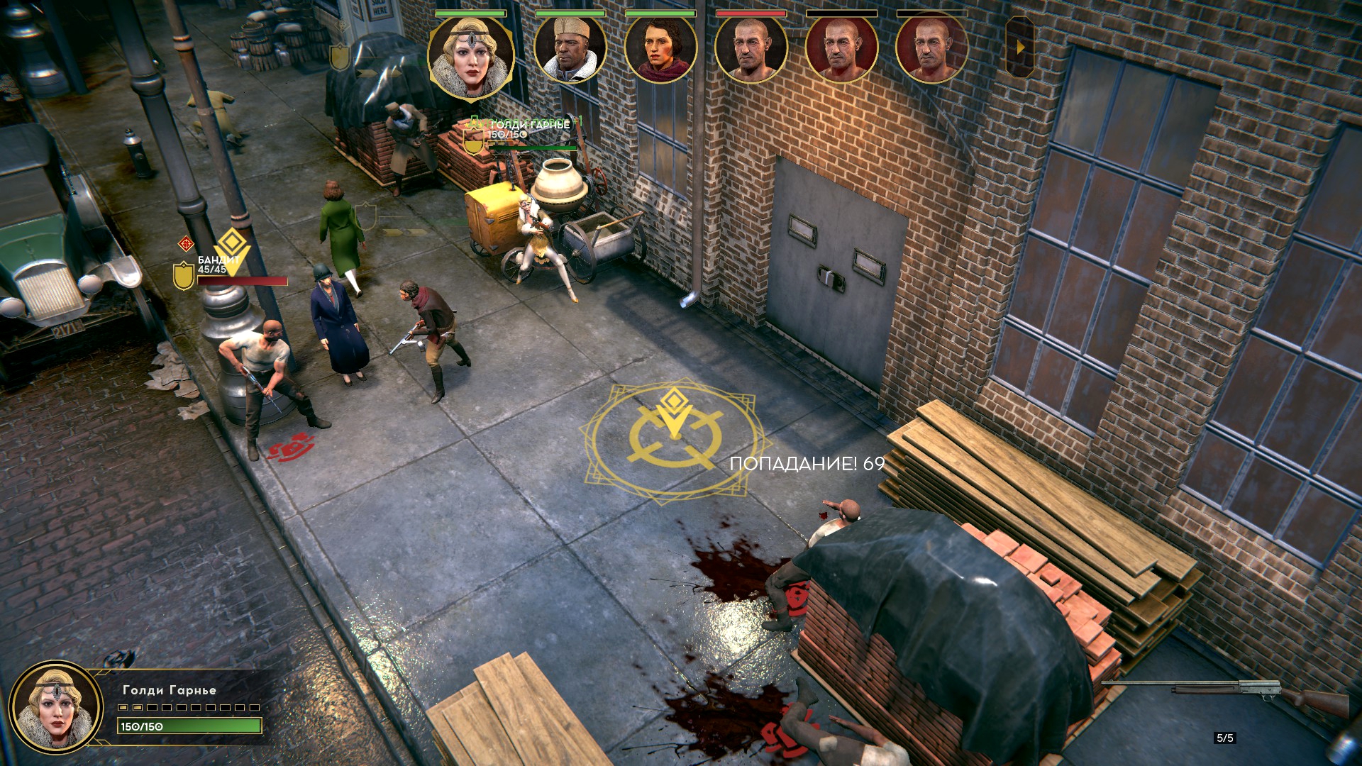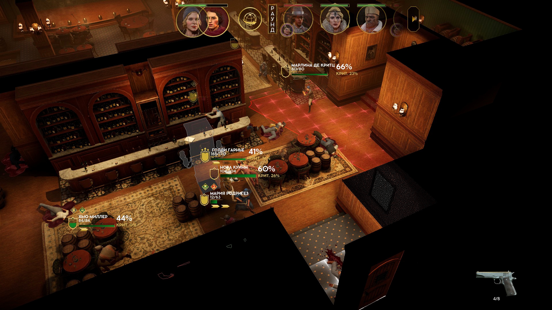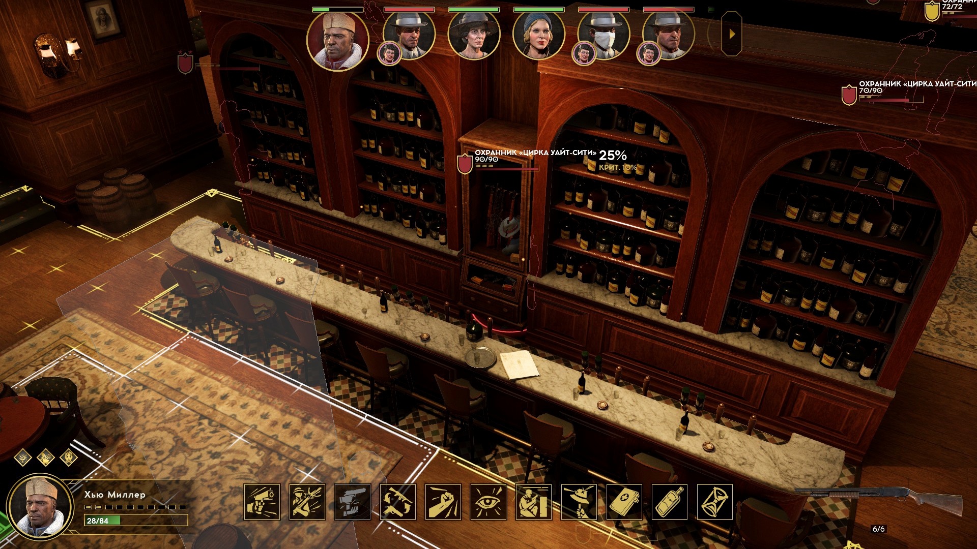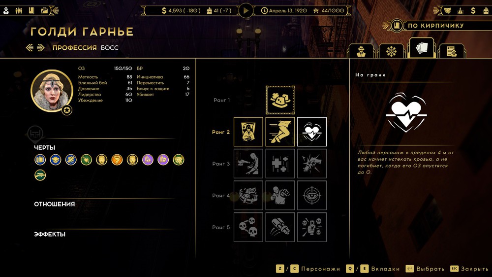 Внутри её логова начался тотальный багодром. Люди начали бегать сквозь интерьер. Разметка применяемых умения отвязывалась от применяющих. В какой-то момент я уже подумал, что без потерь не выберусь. Как вдруг случился Darkest Dungeon! Обычно ранения понижают боевой дух и характеристики. Кроме этого у гангстеров есть любовные отношения, и, если романтический интерес при смерти, статы тоже падают. Внезапно, моя пулемётчица оказалась самовлюблённой, и её всё заколебало конкретно. Сильное падение морали открыло черту, позволяющую автоматически пустить три очереди по врагам с низким здоровьем – «добить слабых».