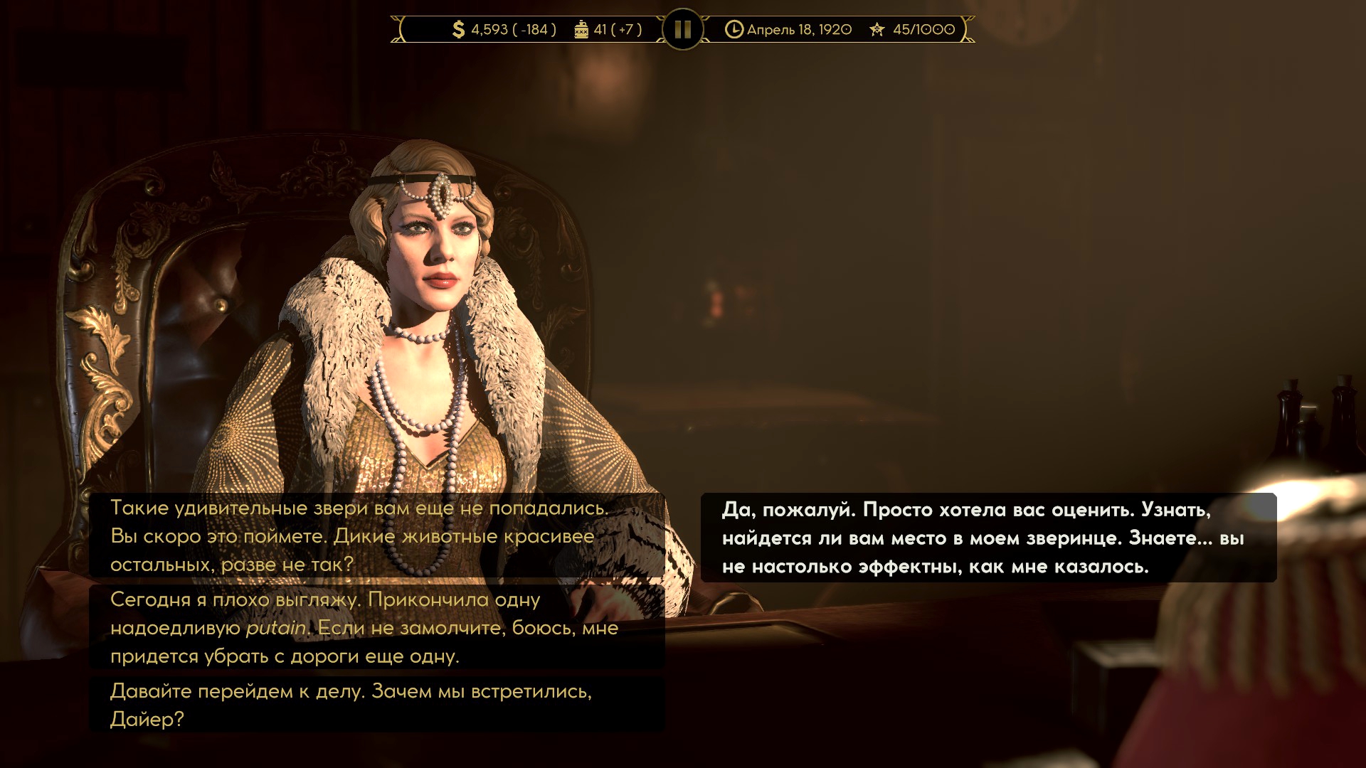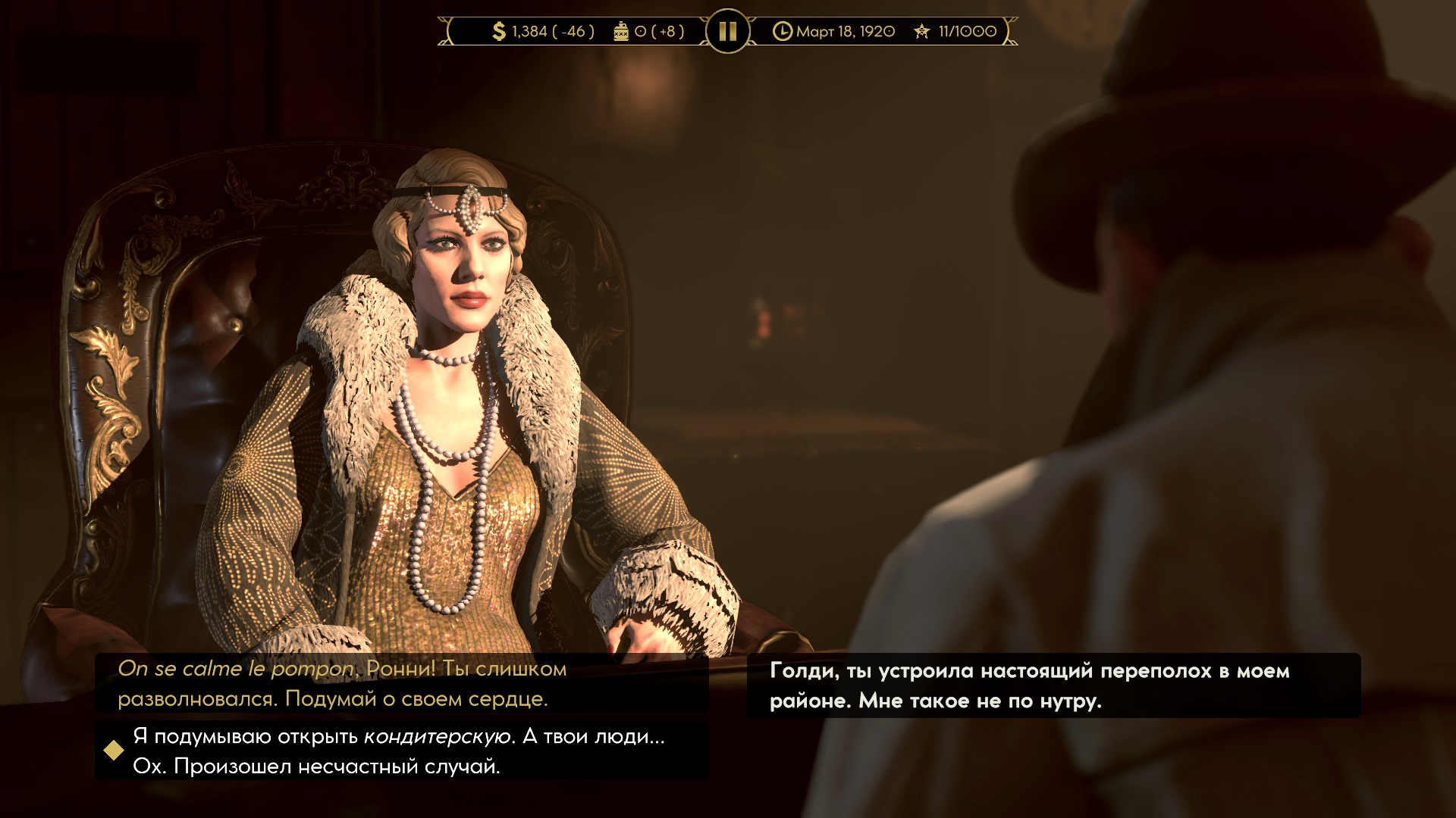 Рано или поздно игрок встретится с конкурентами – другими криминальными авторитетами. Они приглашают поговорить – и это одна из лучших частей игры. Реплики прописаны вручную и озвучены, боссы обмениваются колкостями, шутки зависят от самих персонажей, а игрок выбирает фразы, ведь он волен пропустить беседу и перейти к делу.