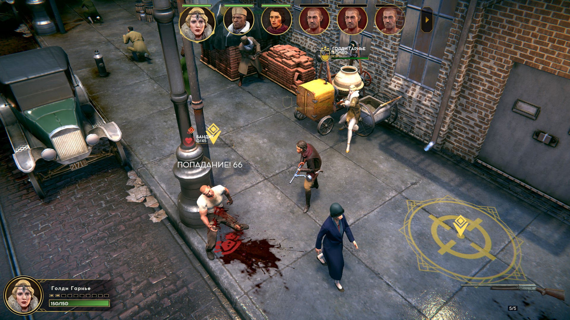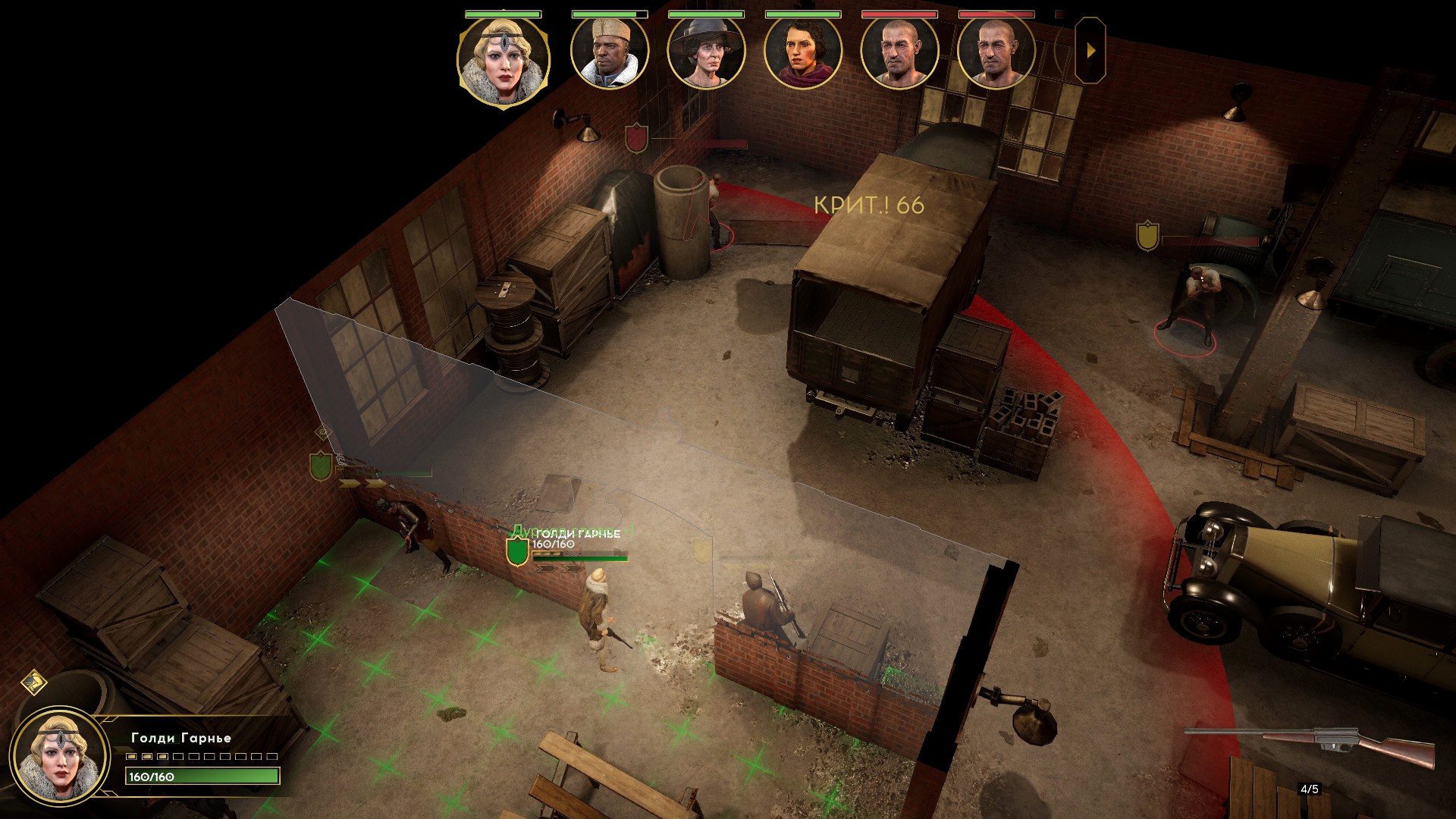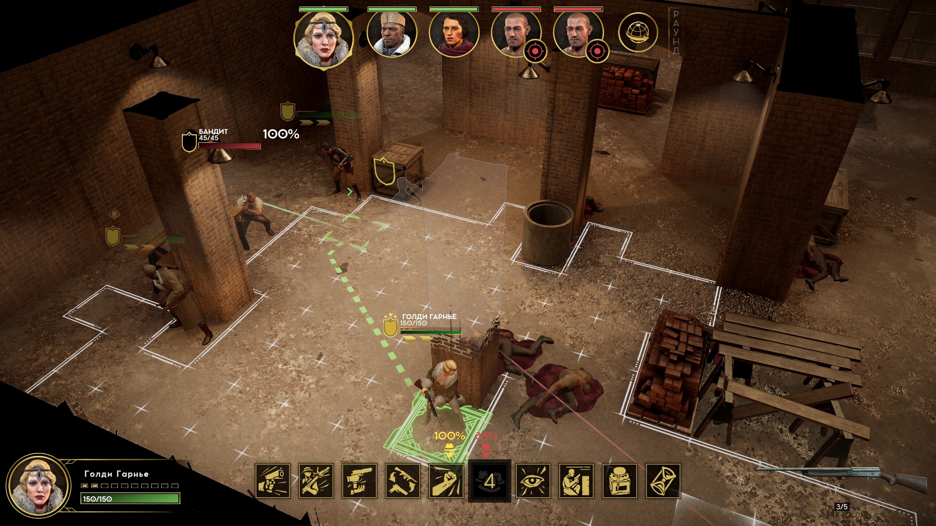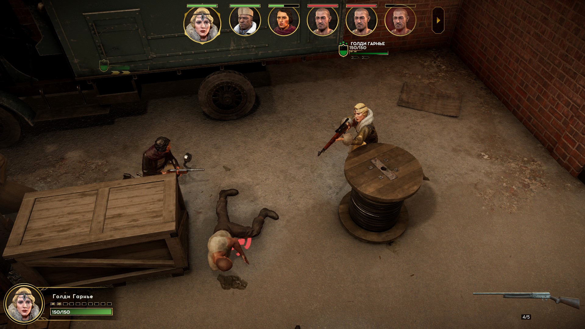 Меня же потянуло на блондинку-певичку Голди, и о своём выборе я не пожалел. Её спецприём абсурдно ультимативен на ранней стадии, и остаётся полезным на поздней. Француженка отмечает до трёх целей и шмаляет по ним из снайперки, которой у неё нет в снаряжении!? Это не шутка, после использования иногда прокачивается навык владения винтовками. Использовать скилл можно с начала боя, потом он откатывается 5 ходов, но ни один противник у меня до этого не доживал.