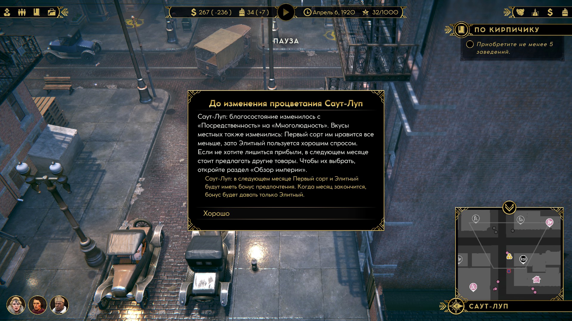 Экономика в игре довольно примитивная. Есть алкоголь, есть заведения. В зависимости от типов зданий потребление разница, а ещё казино могут понести убытки от рандомного шулера, однако в целом – больше точек рэкета = больше доход.