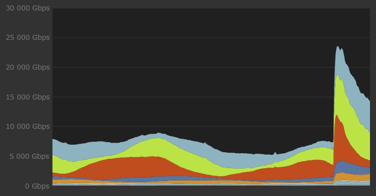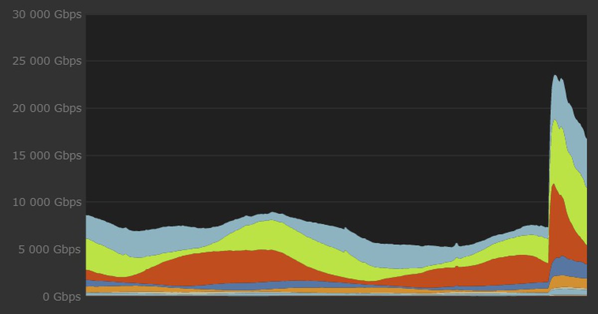 Это означает, что каждую секунду игроки загружают 1792 гигабайта данных. Примерно половина этого объема приходится, видимо, на предзагрузку Cyberpunk 2077: сутками ранее нагрузка на CDN была приблизительно вдвое ниже.