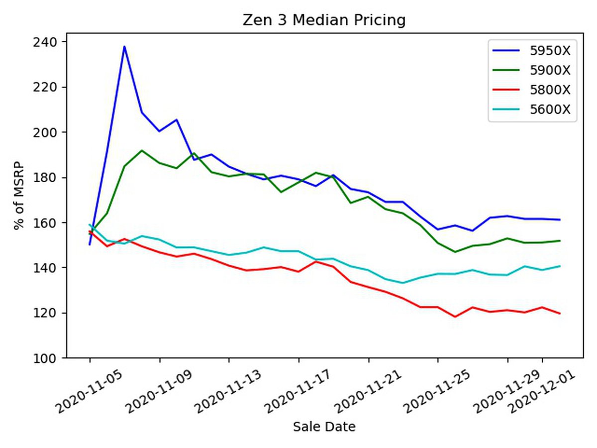 Выгода от перепродажи новейших процессоров AMD также постепенно снижается. Однако в последнее время цены, кажется, вышли на плато: видимо, AMD все еще не удается полностью удовлетворить спрос.