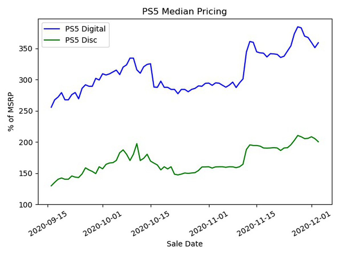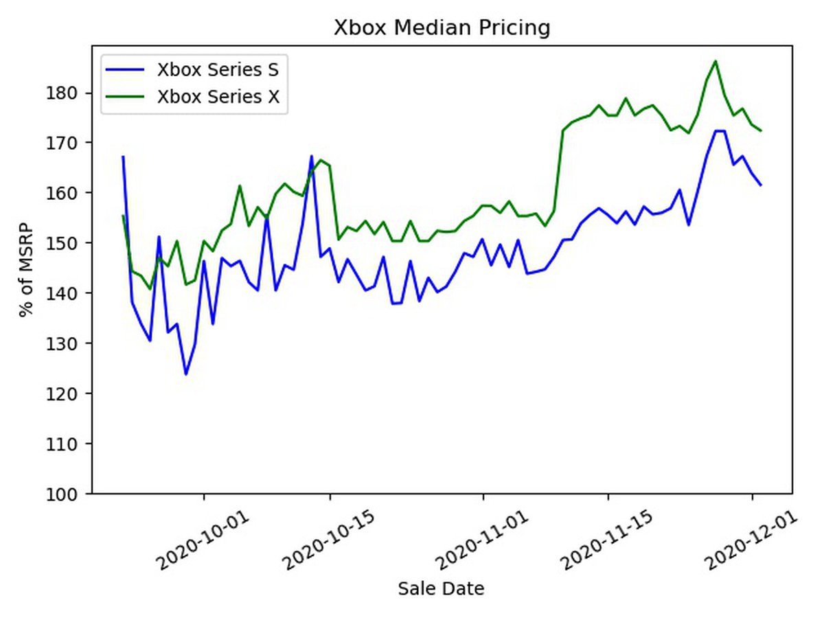 С PlayStation 5 и Xbox Series ситуация иная: здесь цена перепродажи увеличивается. Некоторое снижение цен наметилось только в самом конце ноября, но пока сложно сказать, продолжится ли оно в декабре.