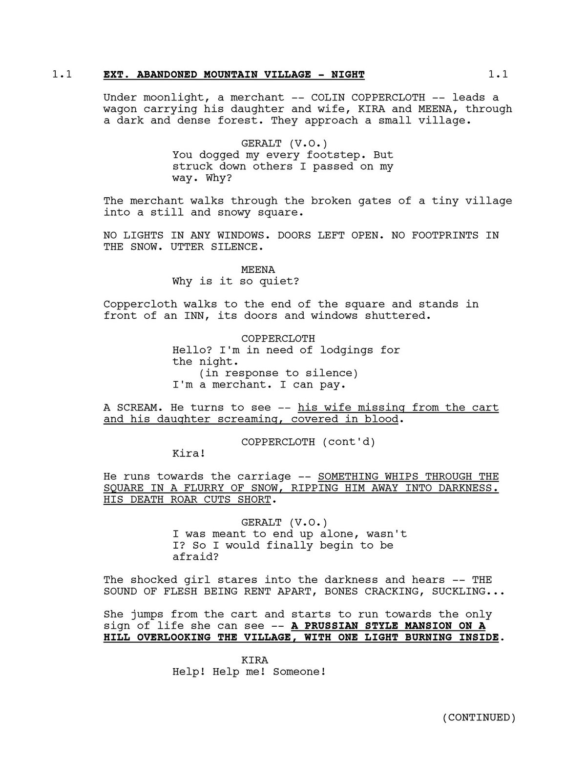 Во-вторых, здесь есть фрагмент сценария второго сезона «Ведьмака». Это флэшбек: история о том, как торговец Колин Копперклот и его семейство приехали в опустевшую деревню, где с ними поступили крайне неприятным образом.