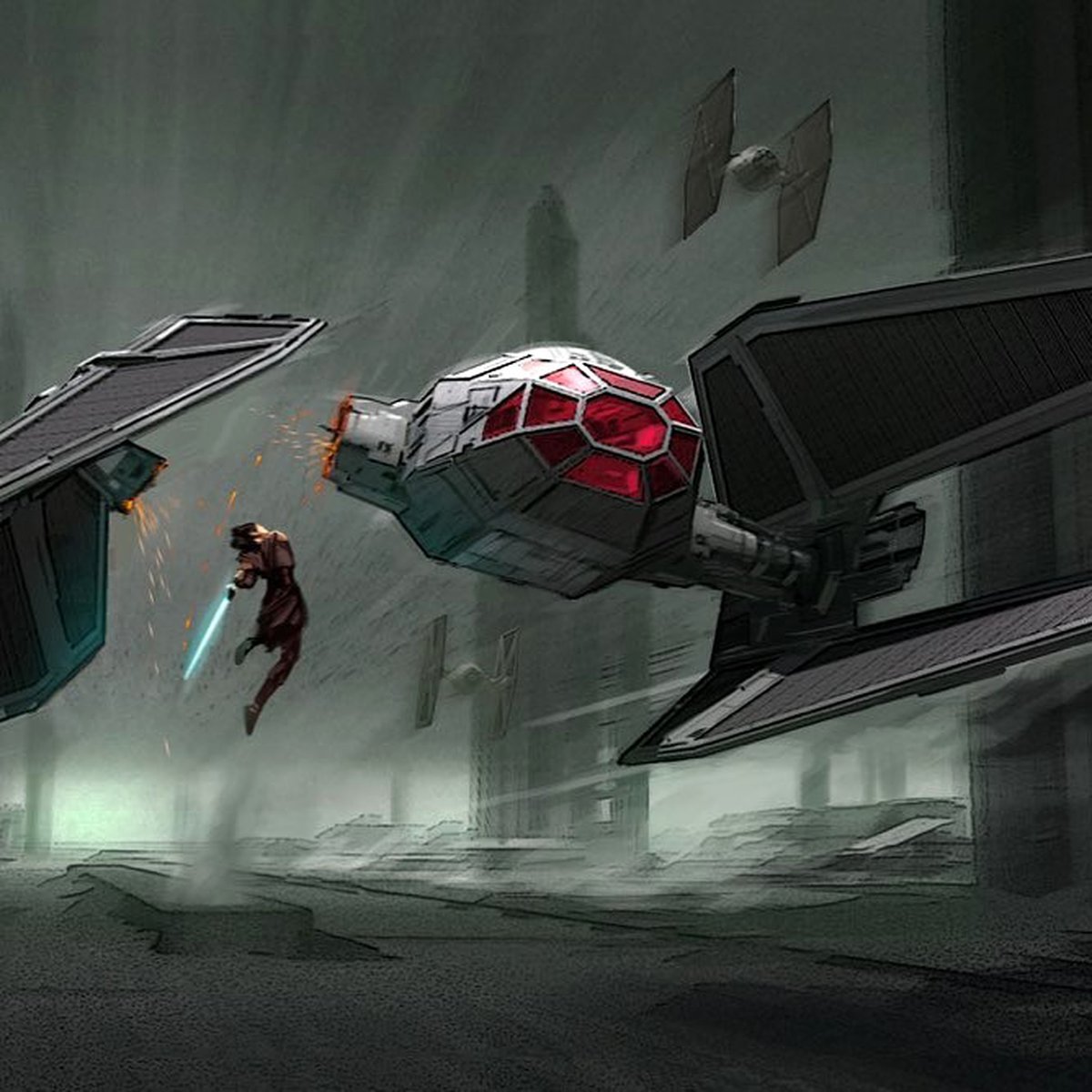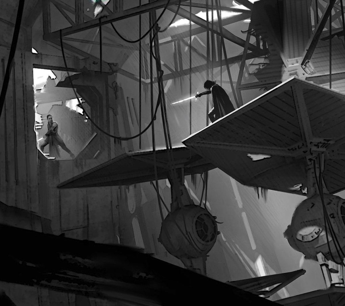 На другом концепте: альтернативная версия сцены с Рей, сбивающей корабль Кайло Рена. Этот арт тоже сделан на очень ранней стадии работы над фильмом, вместо пустыни события происходят на Корусанте.