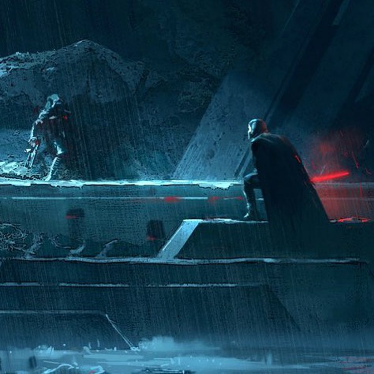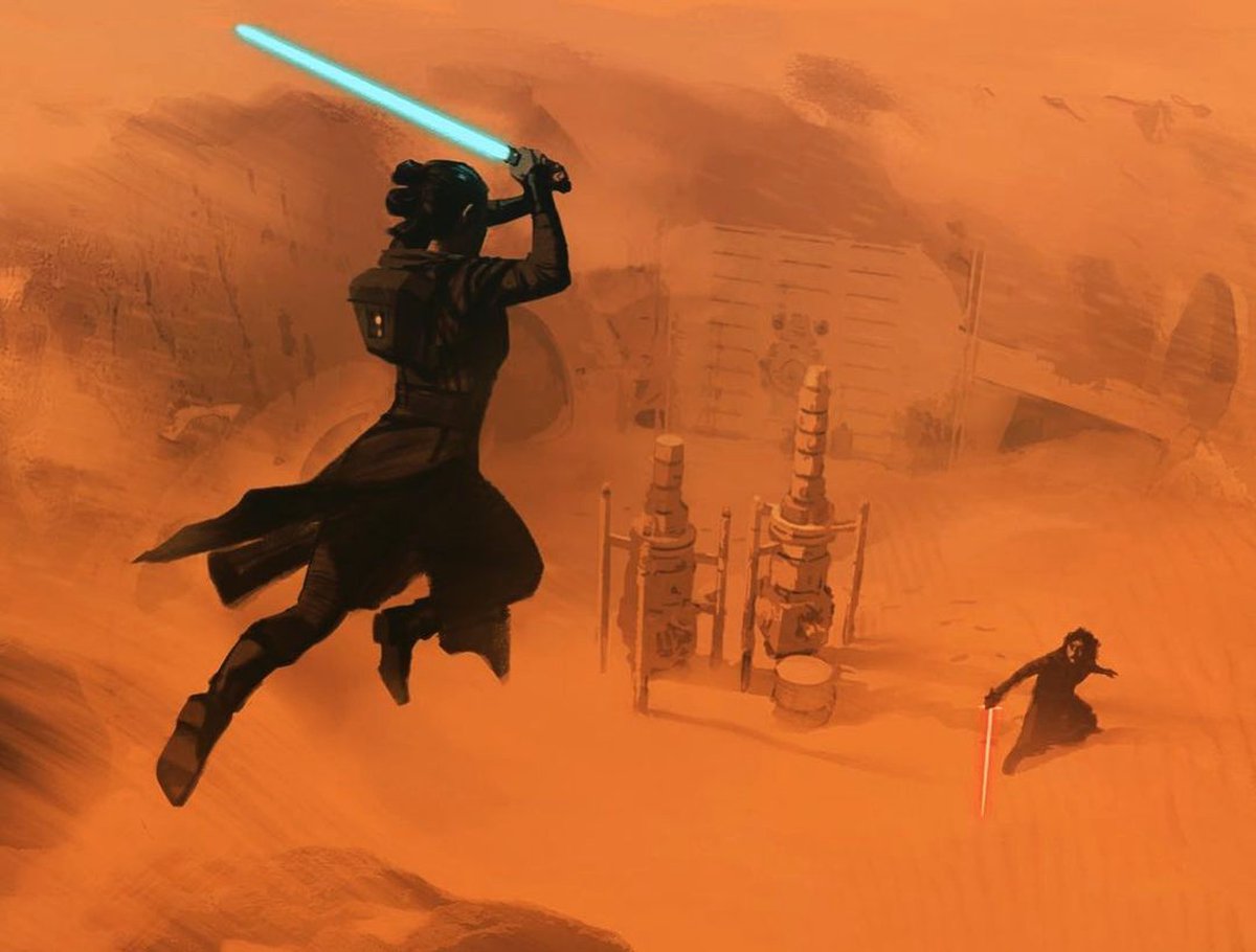Еще один арт показывает дуэль Рей и Кайло Рена где-то на Татуине — возможно, полагают фанаты, примерно там же, где в свое время жил Люк Скайуокер.
