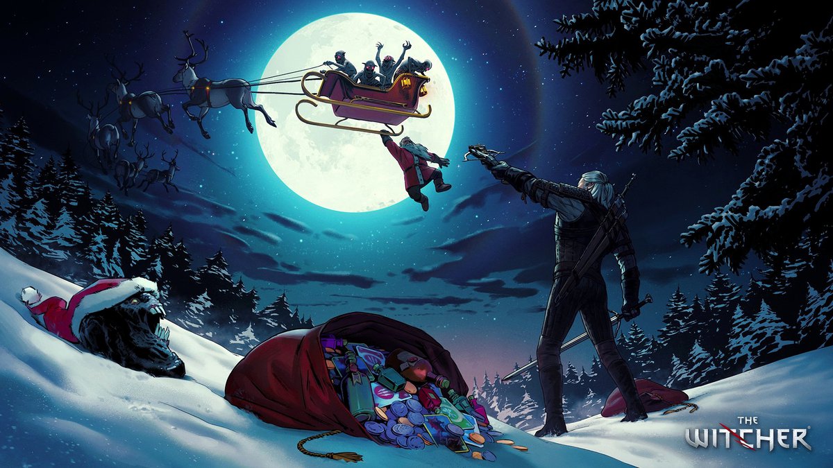 У обычной открытки масса трактовок. Возможно, на Деда Мороза напали накеры, а Геральт пытается его спасти. Возможно, Дед Мороз на самом деле не тот, кем кажется, и давно спелся с накерами-эльфами, а Геральт только что негодяя.
