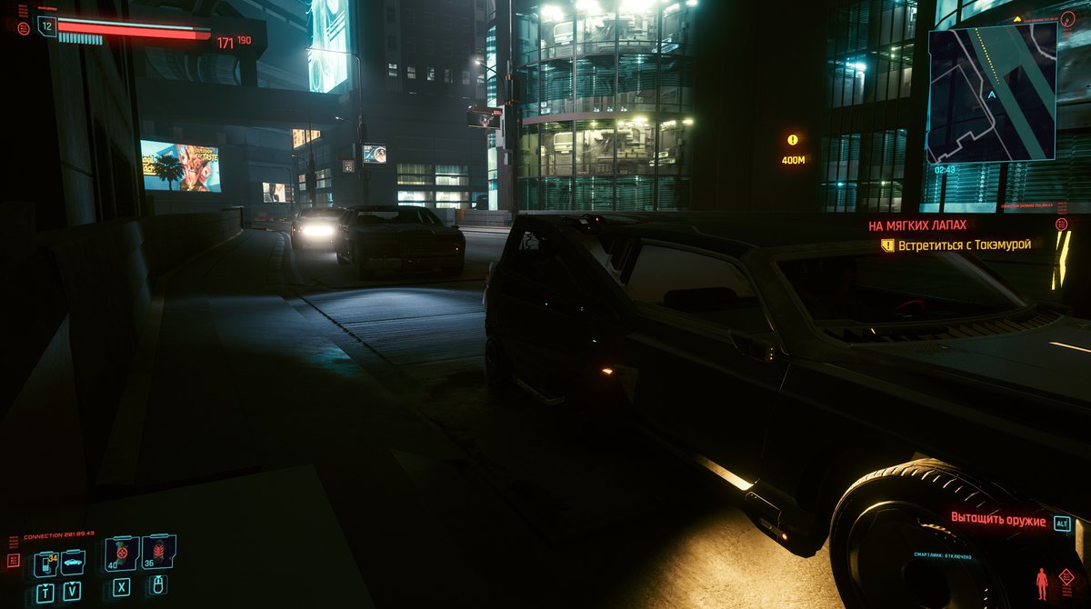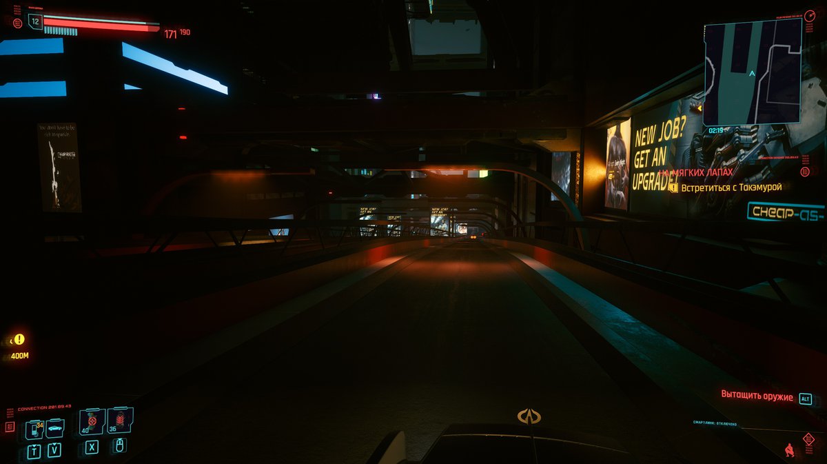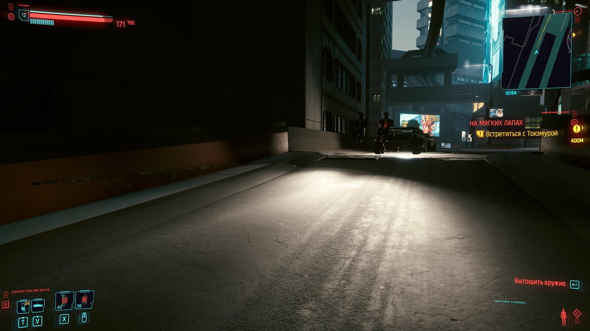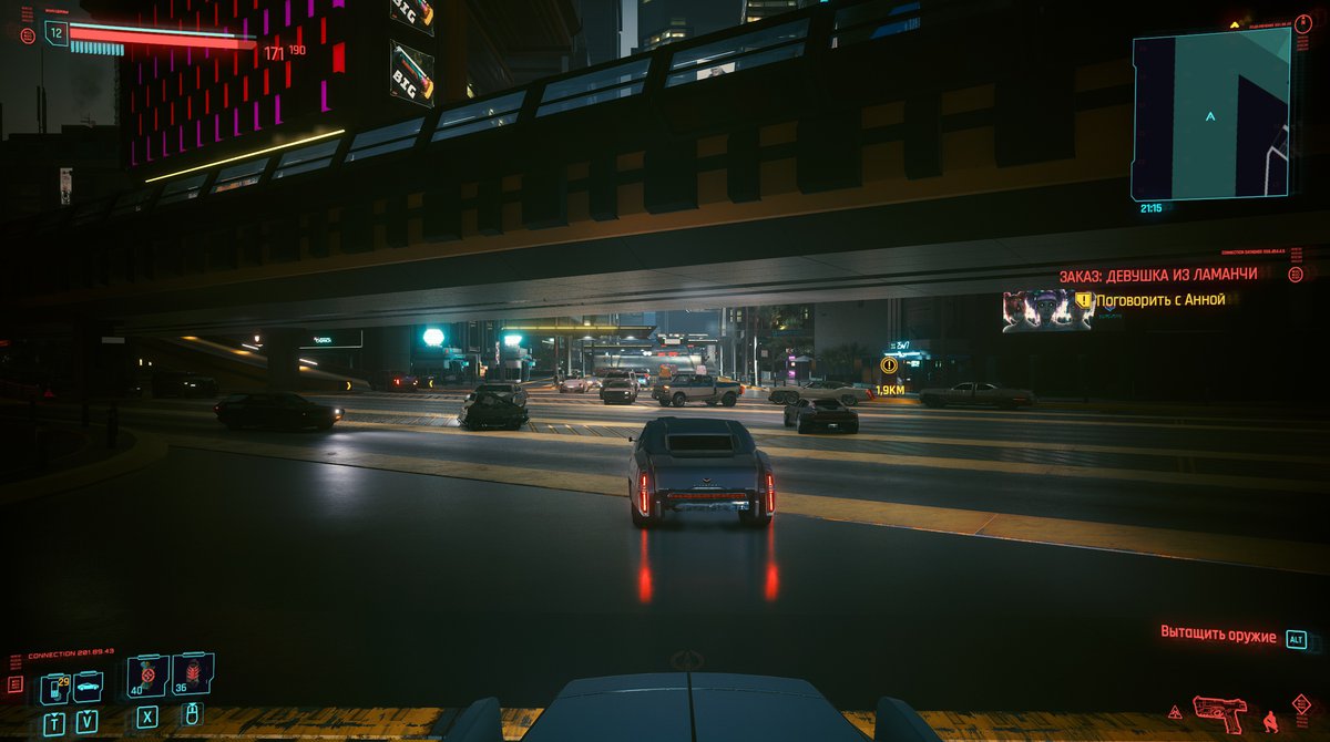 Зато путешествие в Кабуки оказалось очень интересным. На этот раз нам повезло: ИИ водителя ни разу не заглючил и машина, на которую мы запрыгнули в деловом центре, проехала аж по трем районам Найт-Сити. Правда, из-за своеобразного прохождения перекрестков на это ушло несколько внутриигровых часов.
