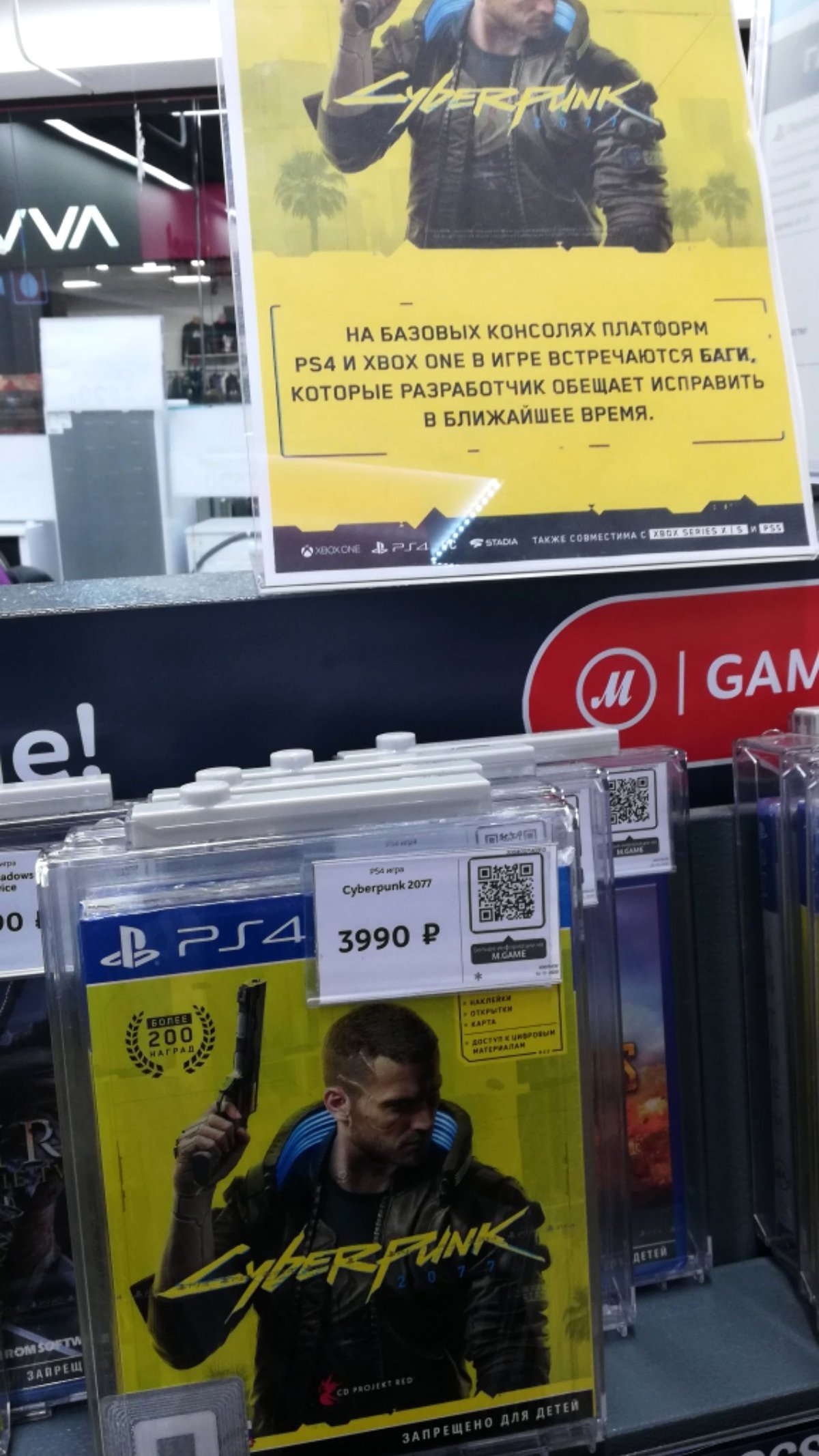 В нескольких магазинах сети «М.Видео» появились предупреждения о технических проблемах Cyberpunk 2077 на базовых консолях предыдущего поколения: PlayStation 4 и Xbox One. Постеры с предупреждениями выставлены рядом со стендами с дисковыми версиями игры.