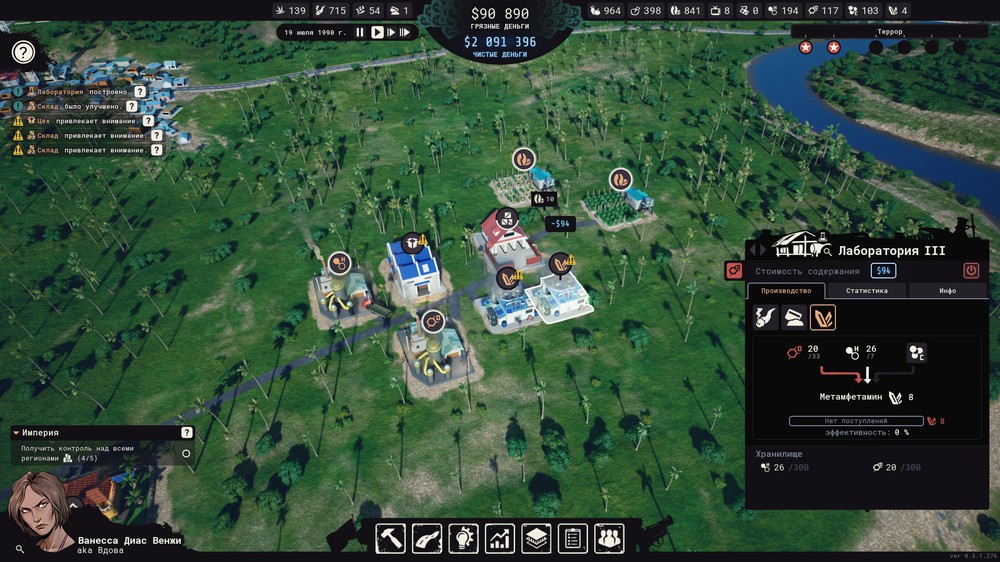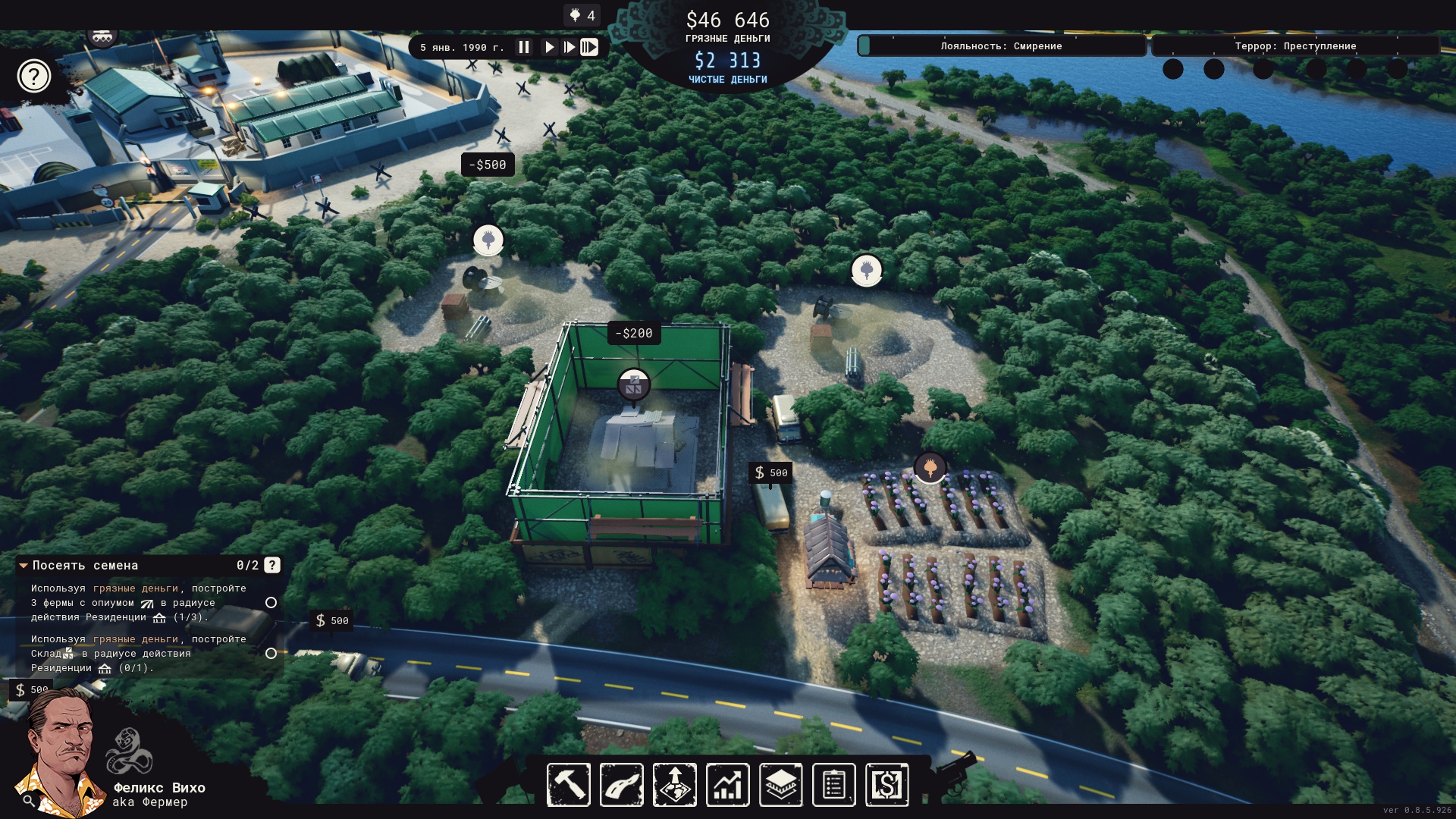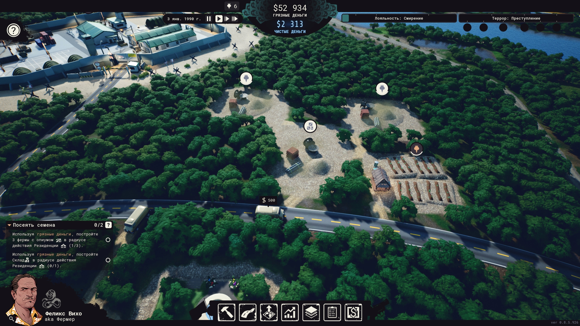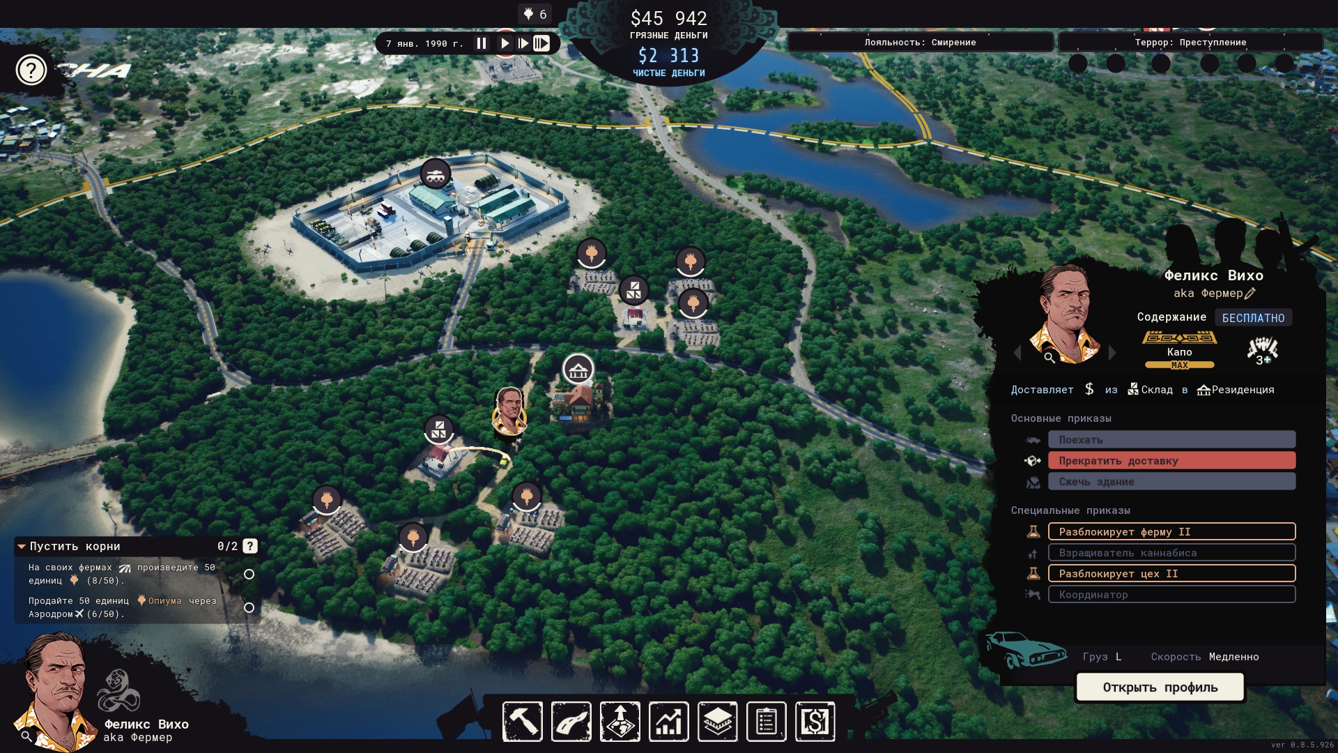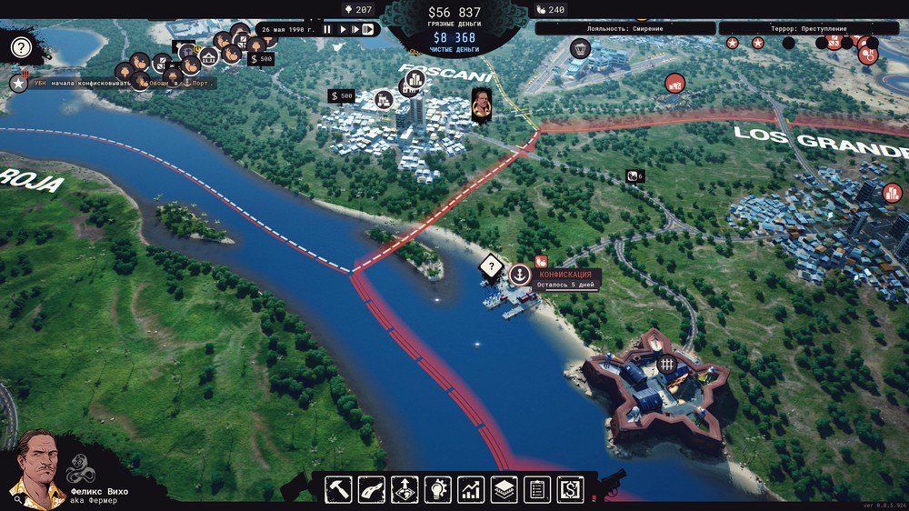 Главный ресурс - деньги, их два типа. Грязную наличку мы получаем посредством толкания дури. За неё можно и здания содержать, и зарплату лейтенантов выплачивать, но придётся перевозить купюры инкассаторами. Хорошо, когда доллары лежат на швейцарском счёте, только проблема перевести. Полное банкротство означает смерть босса, а если ещё и подручные не были заблаговременно наняты – gameover. Это Латинская Америка, здесь с вами никто церемонится не будет!