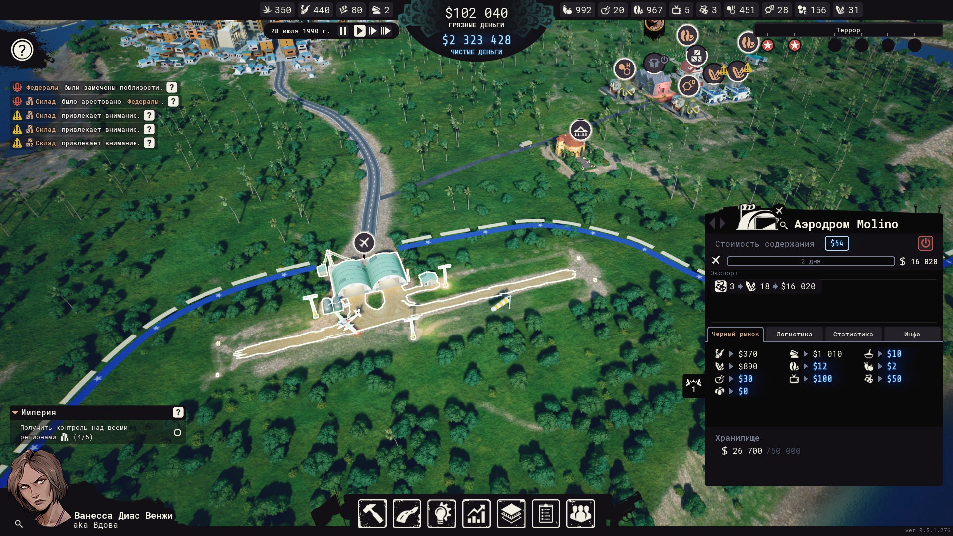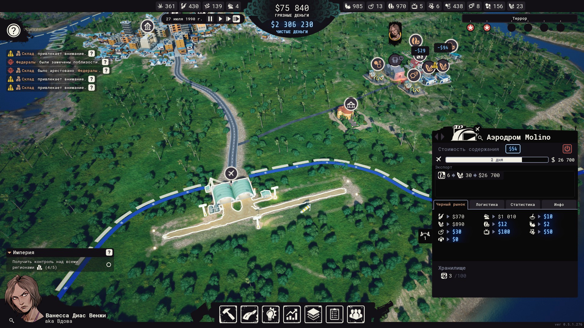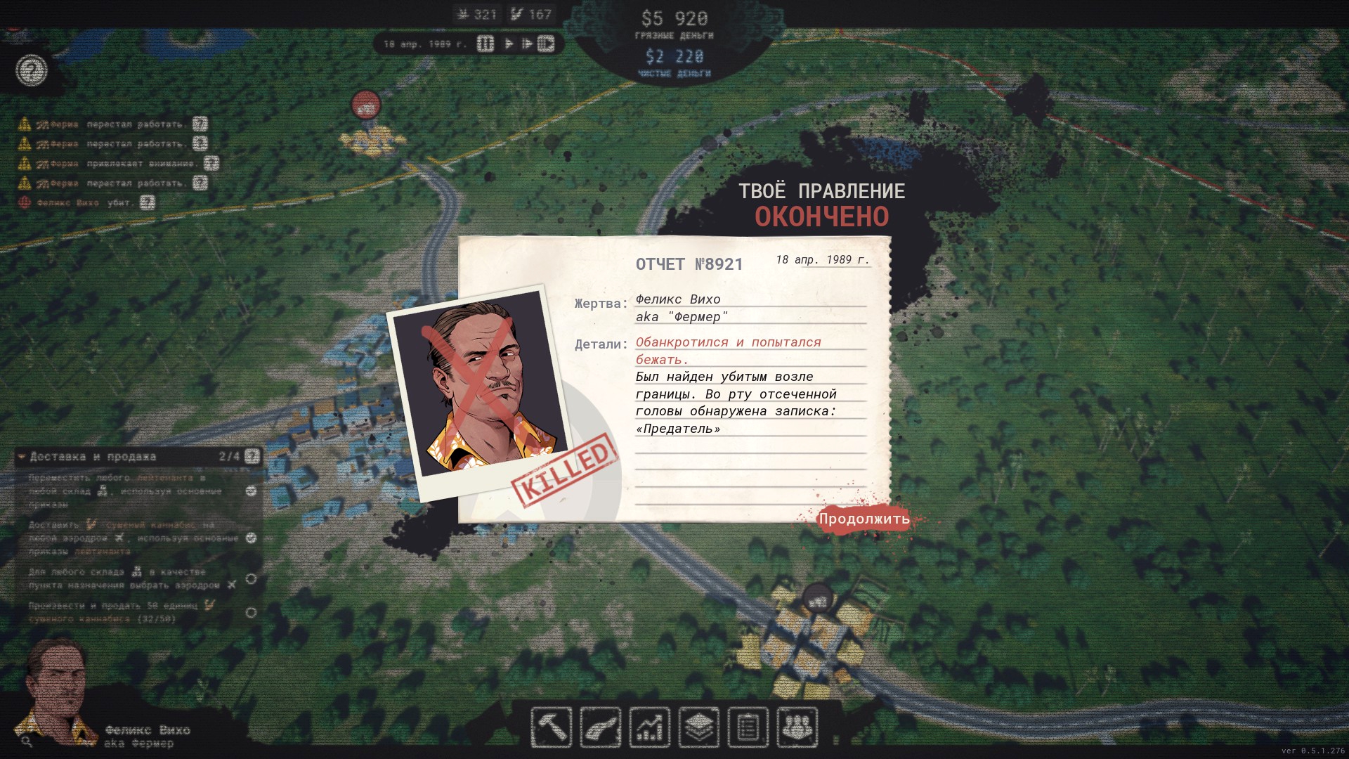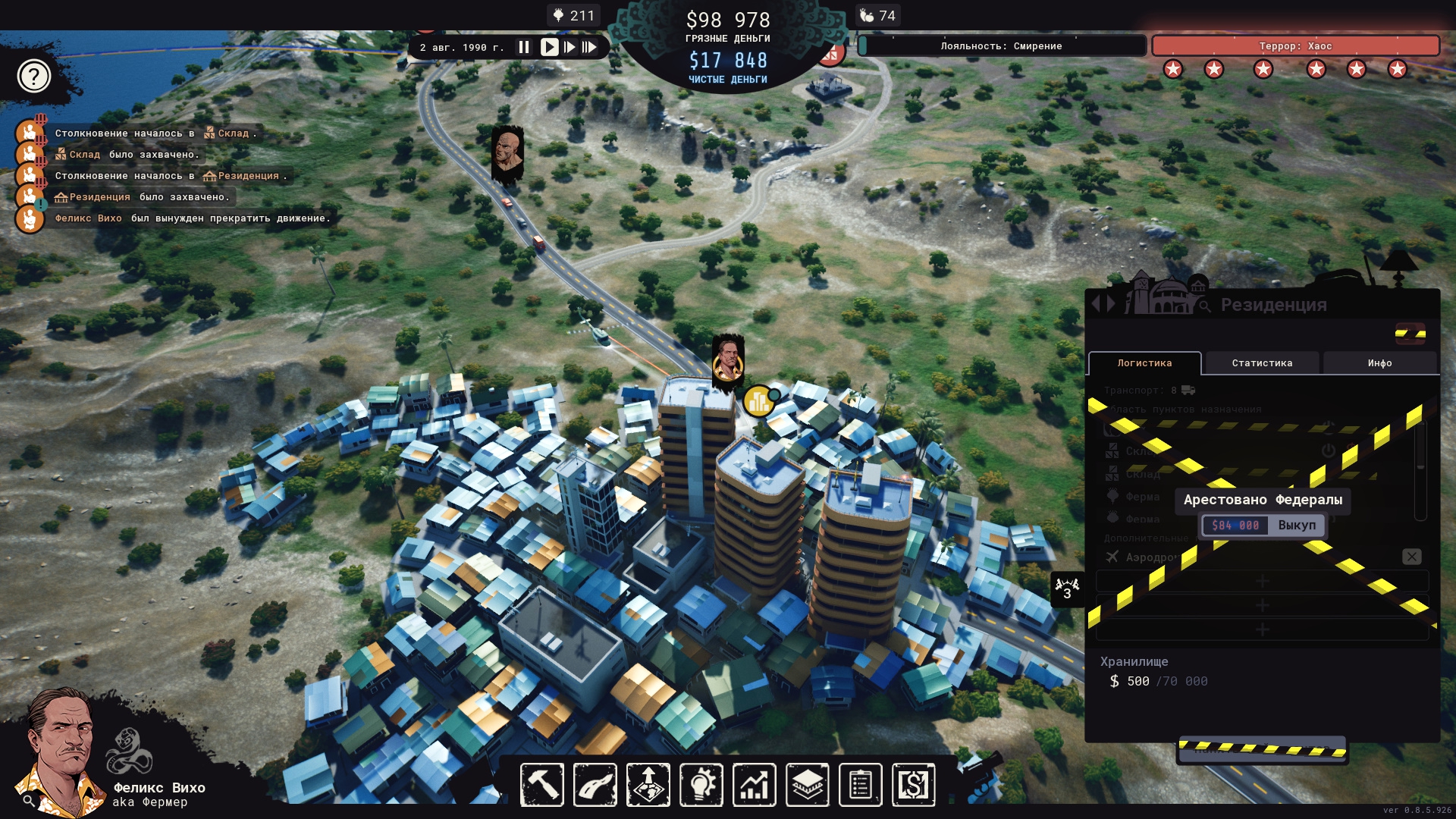 Отлично, ставим нового управляющего, чистых денег остаётся 50к, зато можно вздохнуть с облегчением? Не совсем. Возможно, ваши заведения уже прикрыли, а требуемый выкуп 80к. Ничё, заработаем? Не факт, империя развалилась, наши аэропорты забрал другой картель, второй город тоже. Отобьём? Опять розыск. Вот и всё – игра зашла в тупик. Можно выкарабкаться, чтобы снова упасть, в надежде на то, что рандом заберёт не самые нужные строения в следующий раз.
