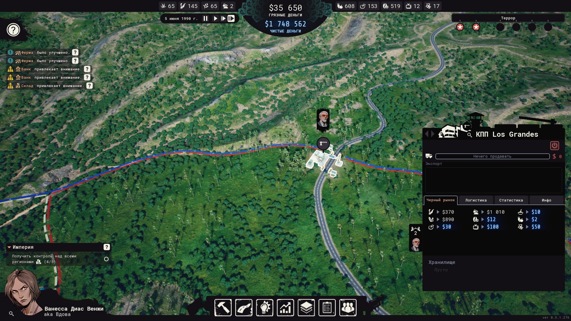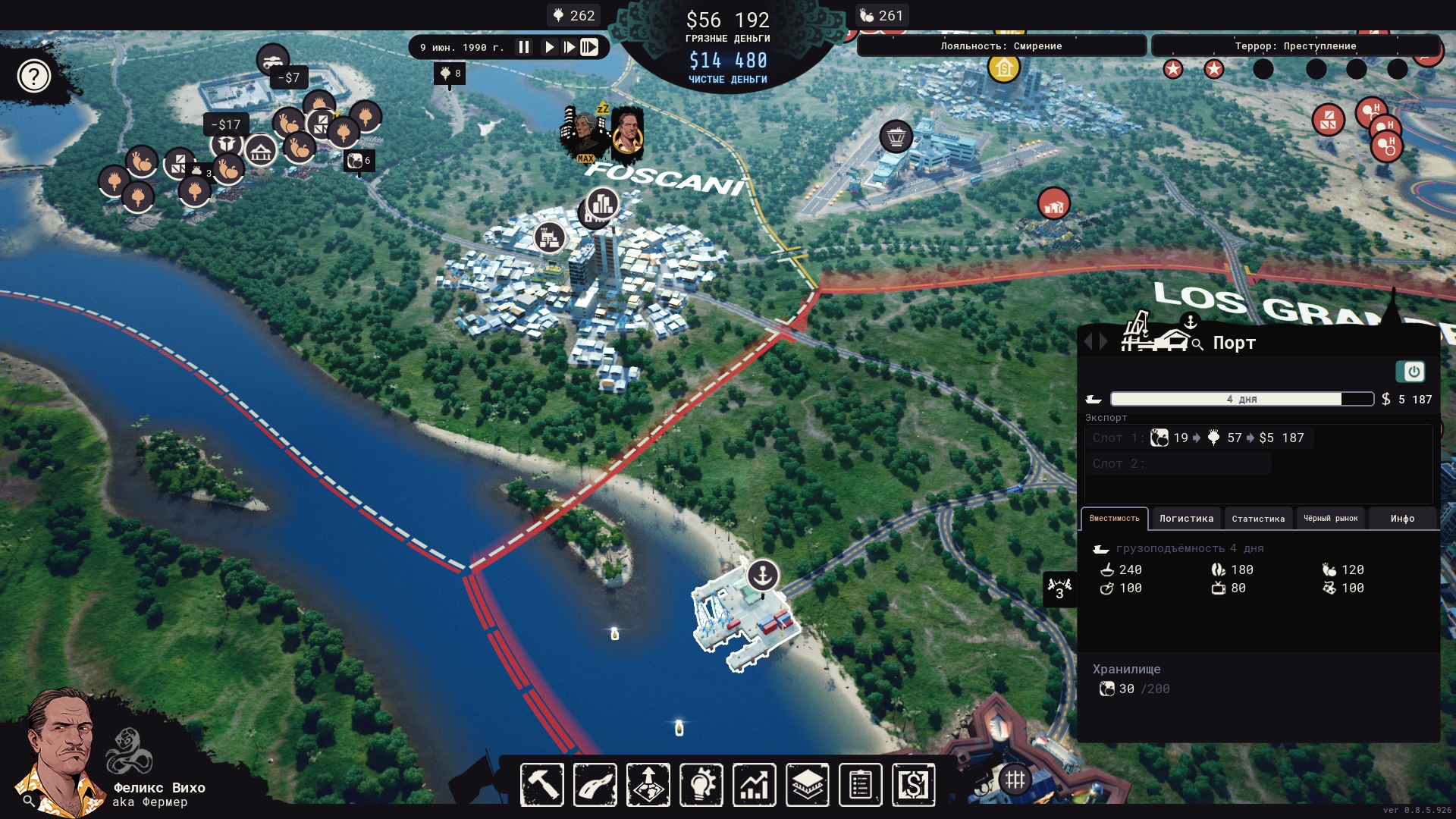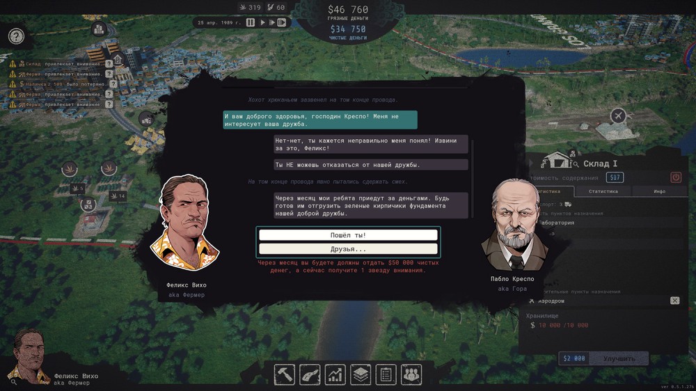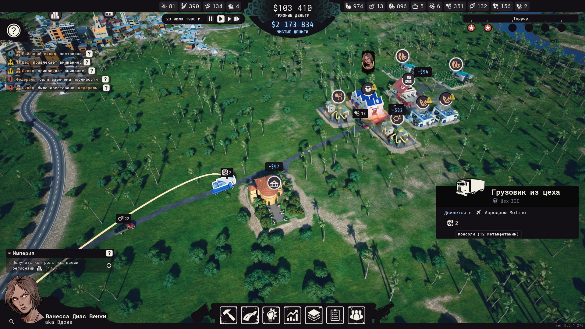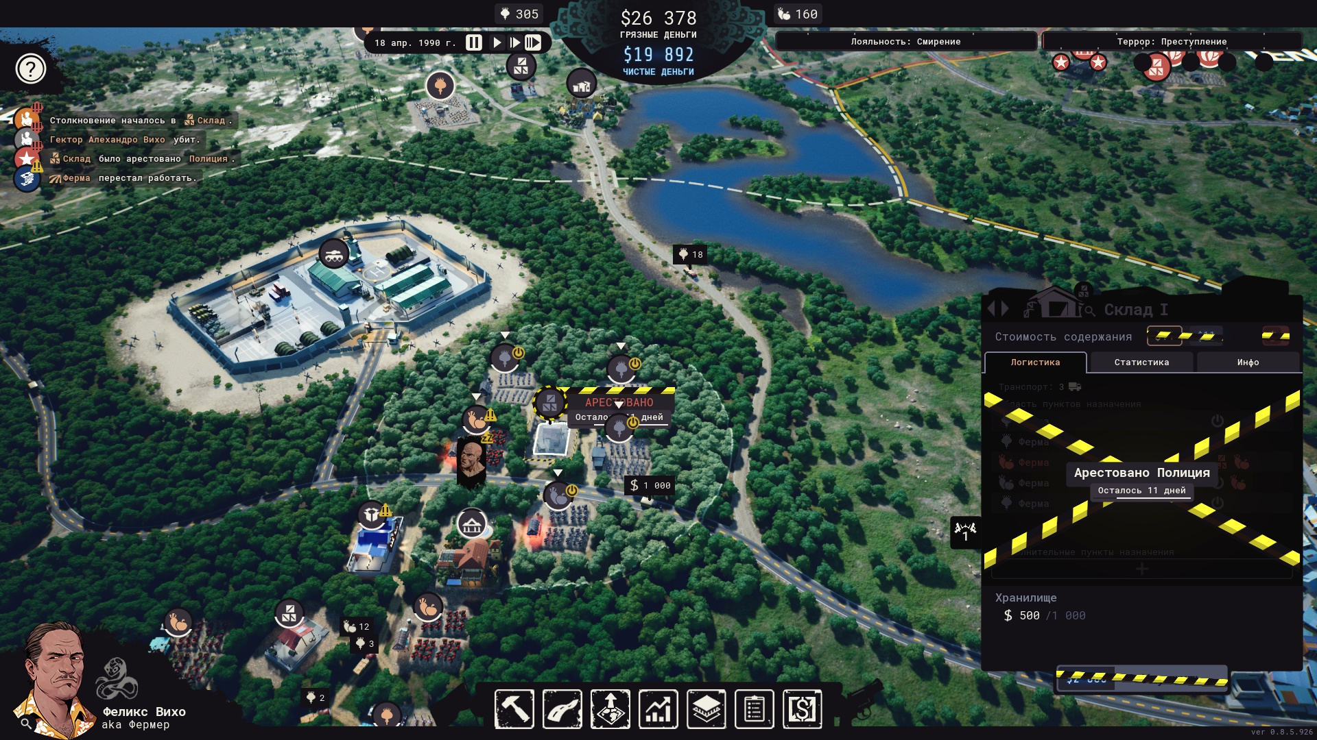 Отлично, ставим нового управляющего, чистых денег остаётся 50к, зато можно вздохнуть с облегчением? Не совсем. Возможно, ваши заведения уже прикрыли, а требуемый выкуп 80к. Ничё, заработаем? Не факт, империя развалилась, наши аэропорты забрал другой картель, второй город тоже. Отобьём? Опять розыск. Вот и всё – игра зашла в тупик. Можно выкарабкаться, чтобы снова упасть, в надежде на то, что рандом заберёт не самые нужные строения в следующий раз.