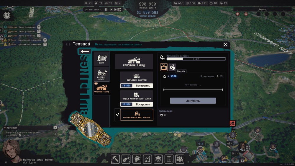 Если растить овощи не хочется их можно закупить, правда по экспортной цене, дураков нет. Но есть вещи которые в данной версии игры нельзя произвести, только купить: телевизоры и игровые консоли. В городе придётся лепить склад на один из 3-4 слотов, вероятно по соседству со зданием отмыва денег, ибо без него никуда. К этому сладу добавить пристройку одну из возможных: продуктовую под всякие кофе и специи, аптеку для ингредиентов сложных веществ или магазин бытовых товаров, то что нам нужно. Ох уже эти города в Латинской Америке, где всего один магазин на населённый пункт.