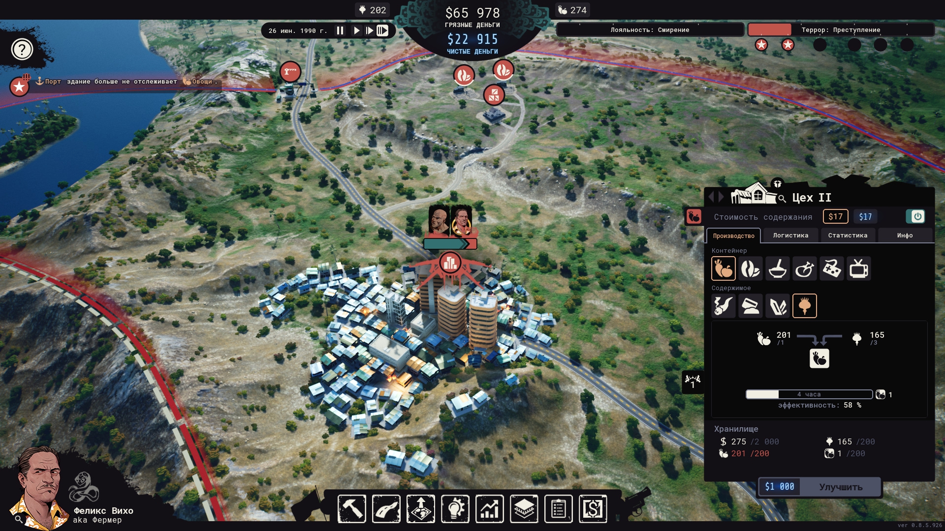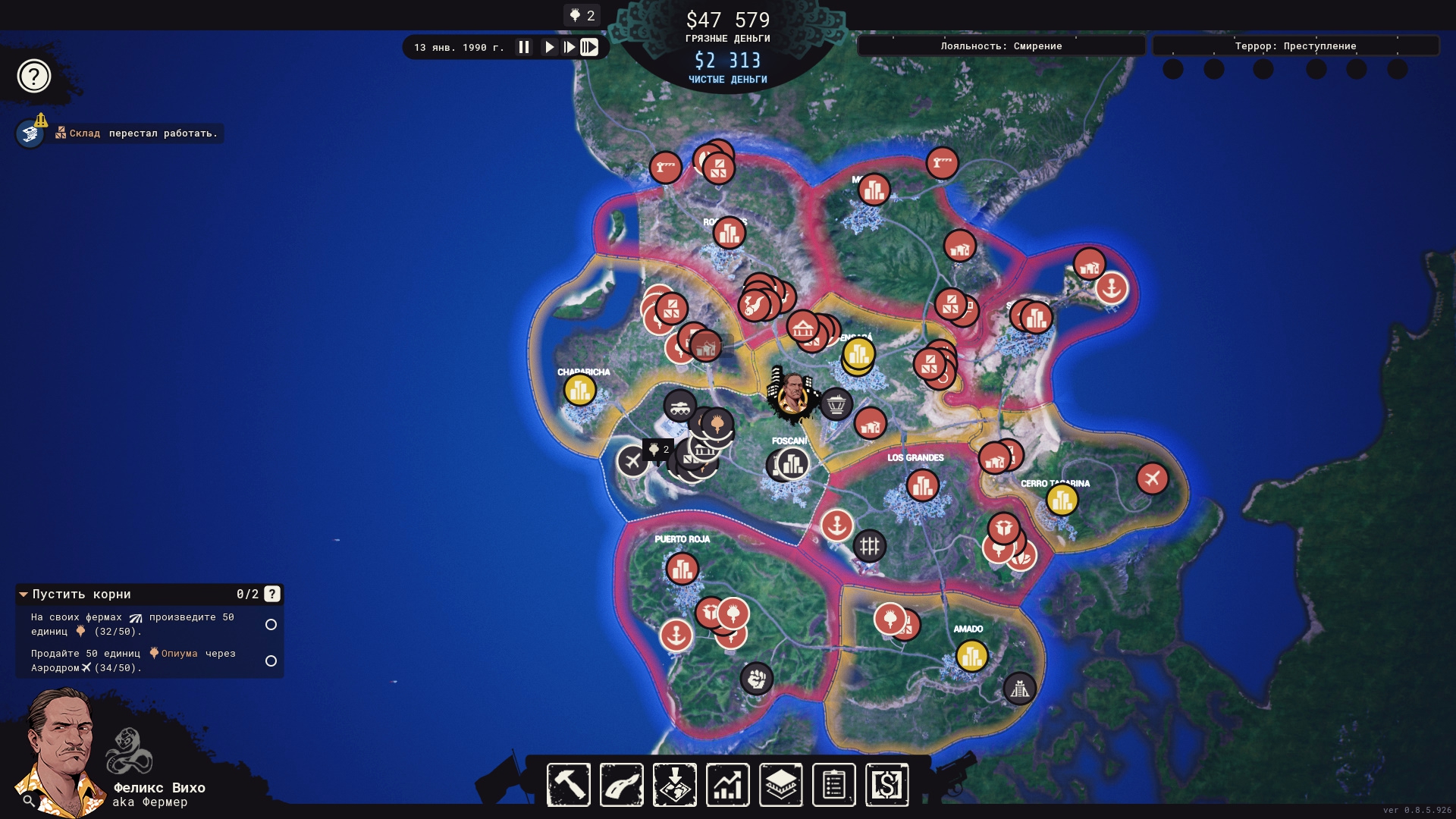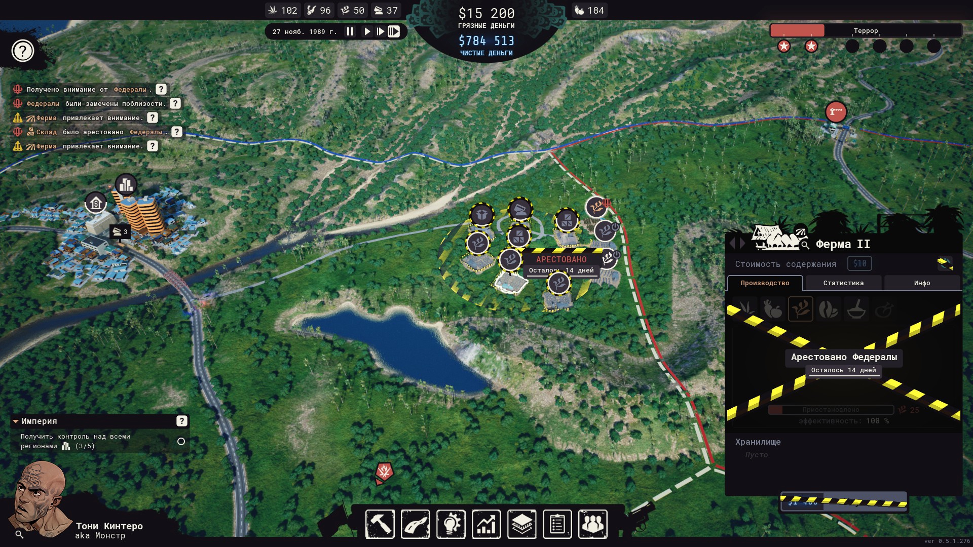 Есть шкала напряжения, в штатном режиме она просто шляпа. Ну спалили органы складик или ферму, террор чуть поднимется, тут же опустится. Более того, при нуле звёздочек, никто даже в гости не приедет. В начале игры мы сидим в очень неплодородном регионе, где плантации работают на 33%. Мы хотим расшириться, а значит воевать с другими картелями. Необходимо взять вражеский город. У каждого гангстера есть сила атаки, нужно просто собрать толпу, у которой показатель превысит защиту объекта, но в момент, когда улицы запылают, напряжение начнёт расти, увеличивая уровень розыска.