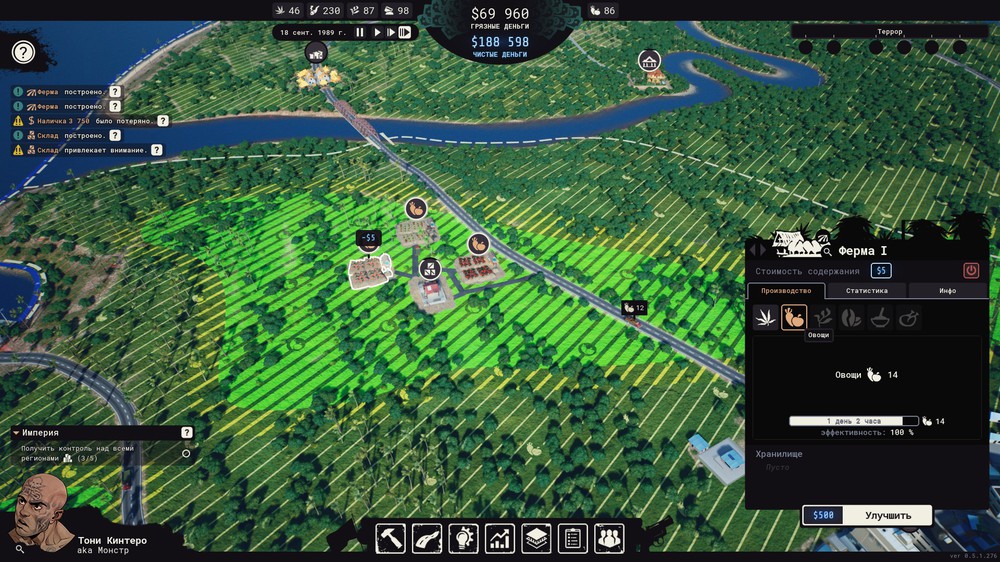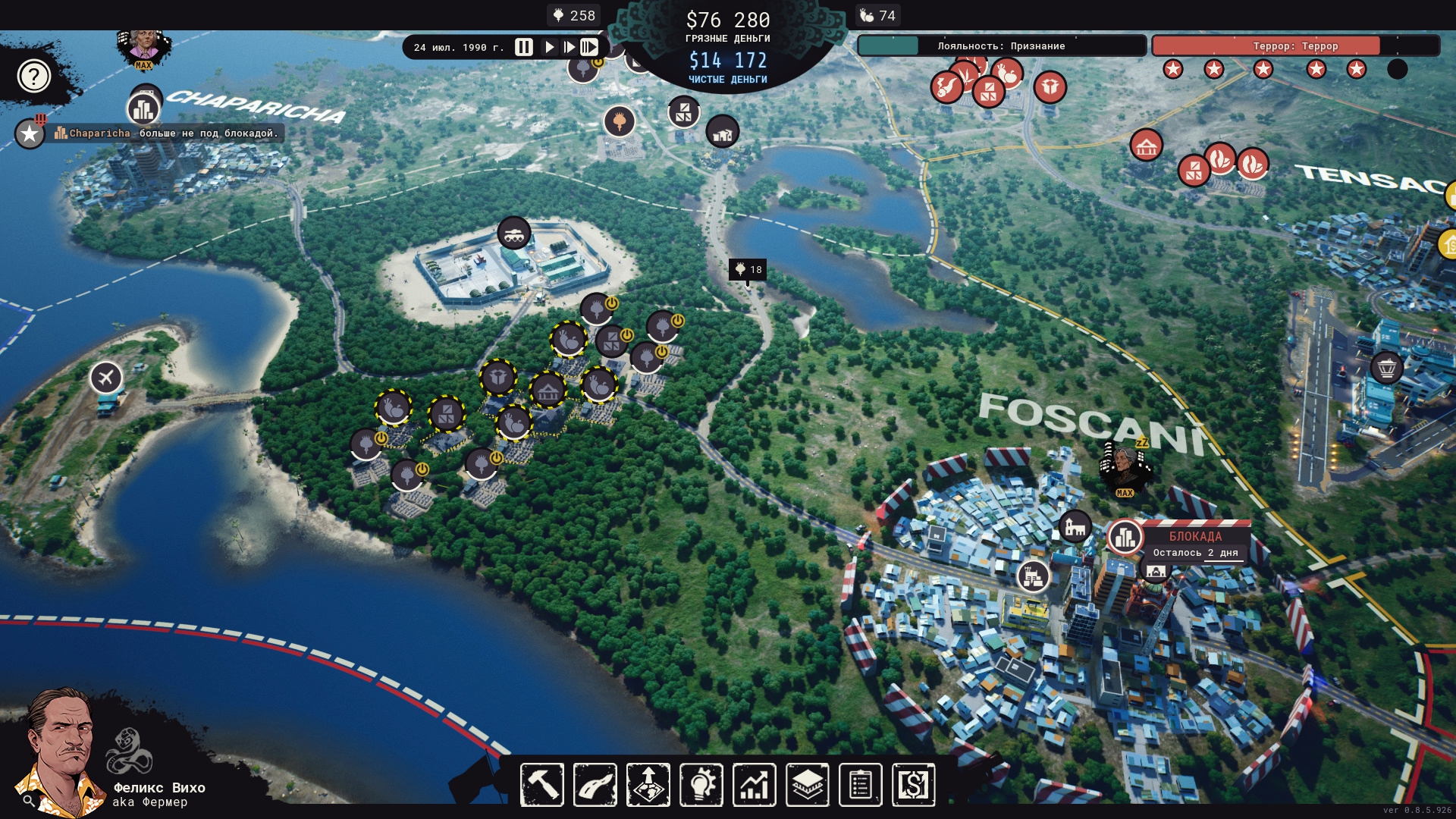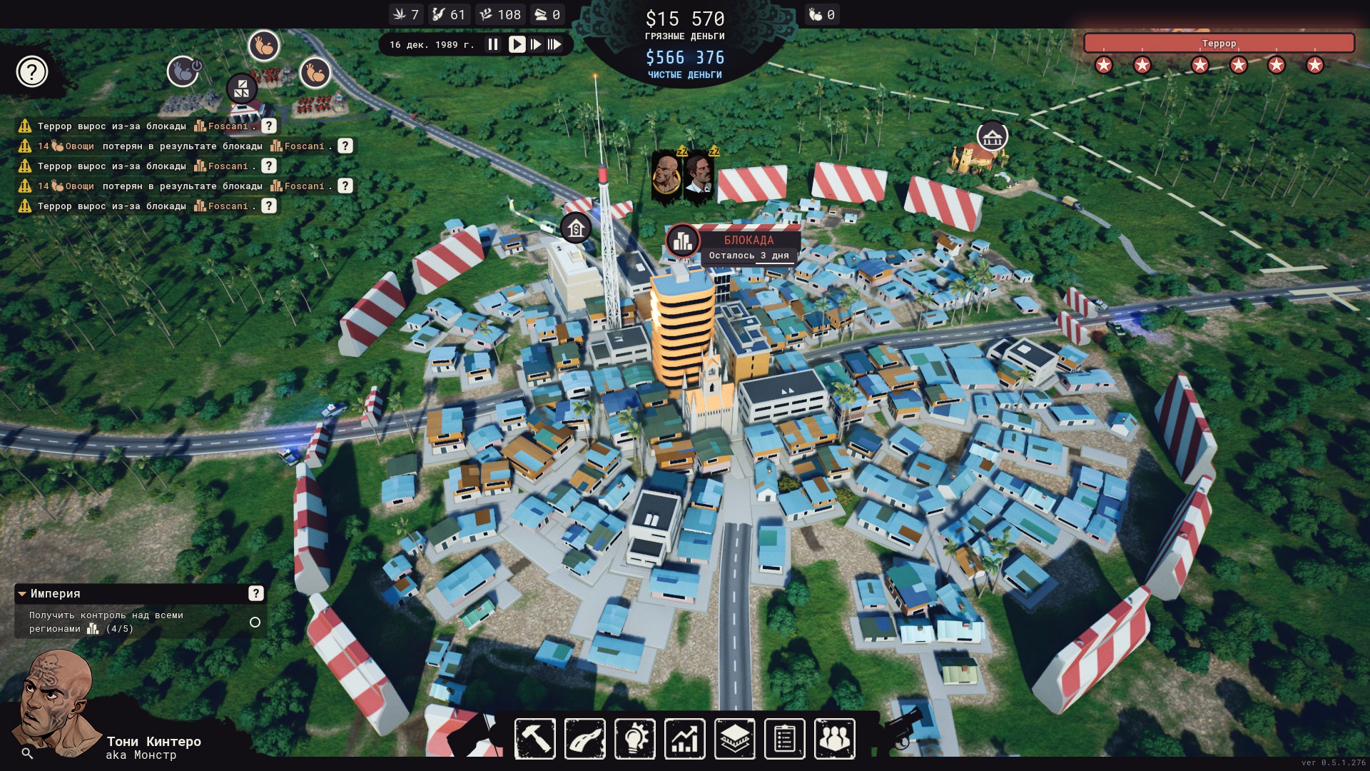 Есть шкала напряжения, в штатном режиме она просто шляпа. Ну спалили органы складик или ферму, террор чуть поднимется, тут же опустится. Более того, при нуле звёздочек, никто даже в гости не приедет. В начале игры мы сидим в очень неплодородном регионе, где плантации работают на 33%. Мы хотим расшириться, а значит воевать с другими картелями. Необходимо взять вражеский город. У каждого гангстера есть сила атаки, нужно просто собрать толпу, у которой показатель превысит защиту объекта, но в момент, когда улицы запылают, напряжение начнёт расти, увеличивая уровень розыска.