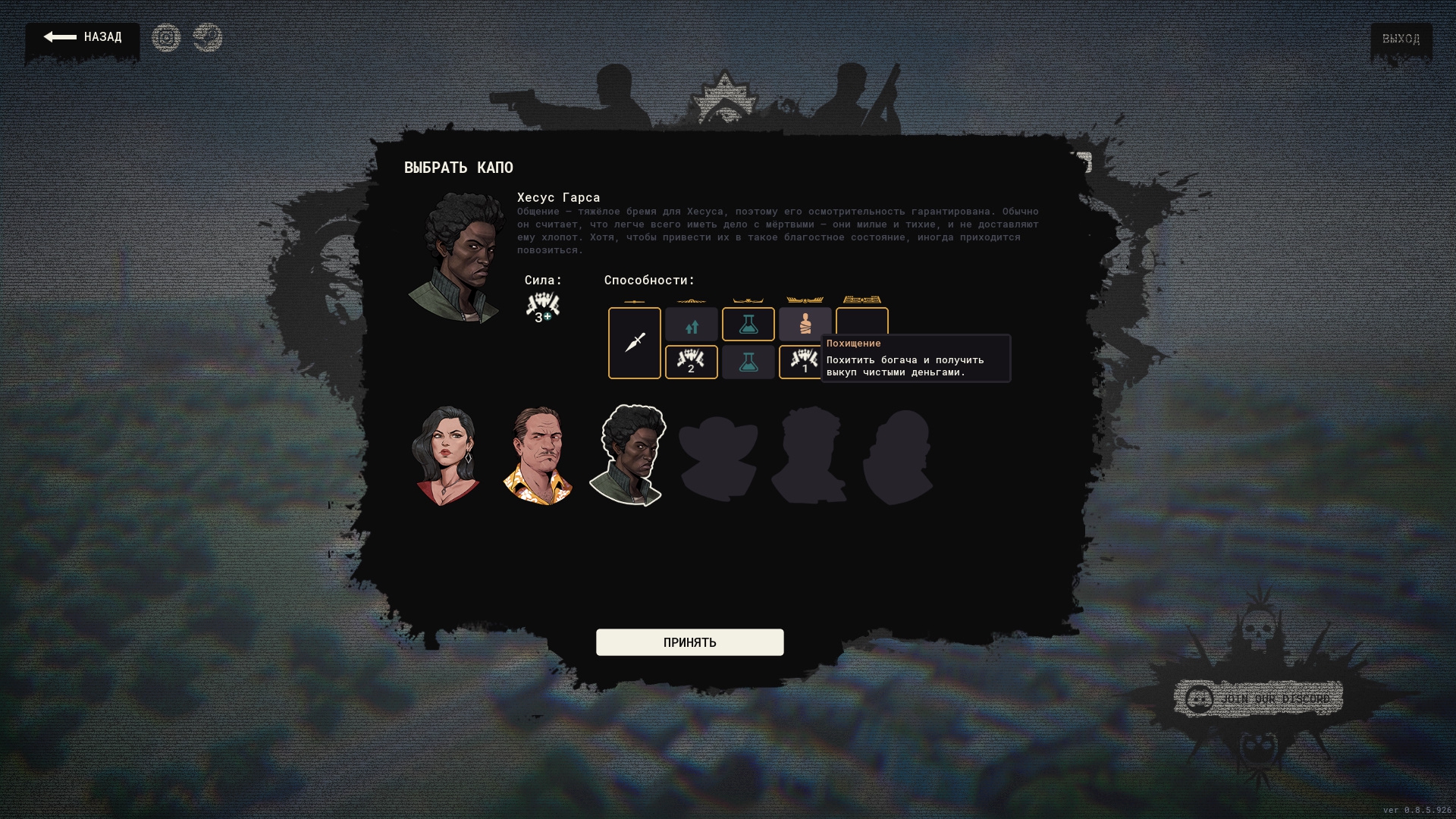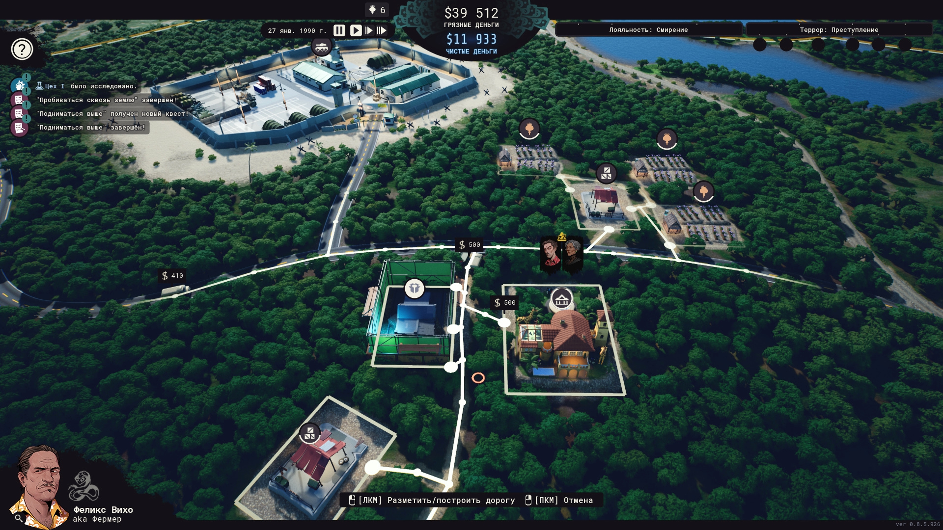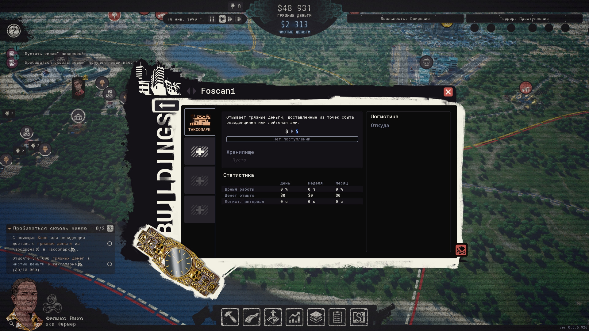 На старте дают выбрать босса и распределить его перки, карта же пока всего одна. Создатель туториала сидел на веществах, и задания не особо хорошо рассказывают об экономической системе, потому я лучше распишу сам, как всё устроено.