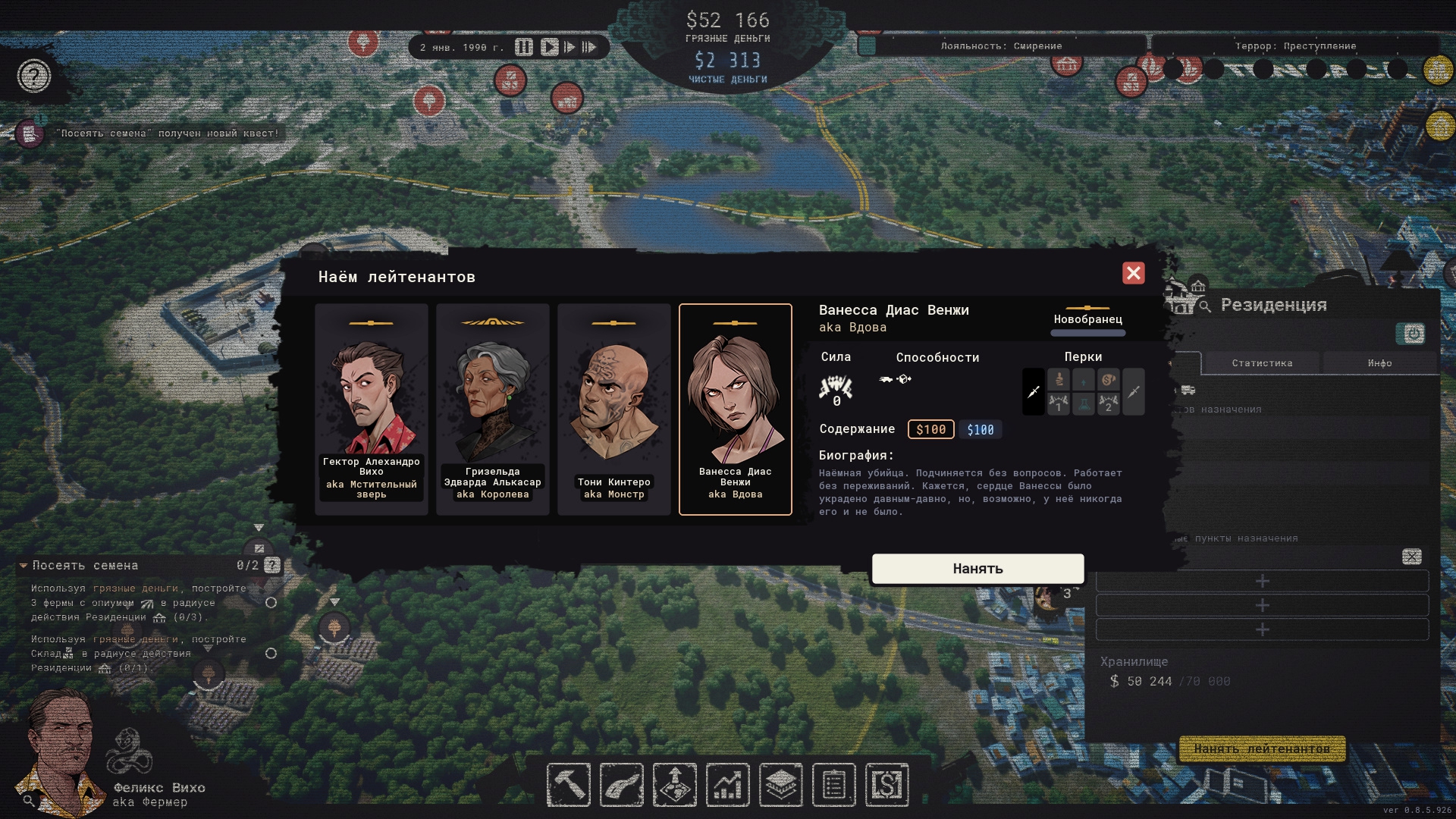 Ещё одна любопытная система в игре – лейтенанты. Они нанимаются в инкассаторской (которая почему-то называется резиденцией), у них могут быть бонусы на повышение производства в области, где они находятся или какие-то активные умения. Например, возможность совершить похищение и заработать лёгких денег, но усилить внимание полиции при этом. Бандиты требуют повышения зарплат и прокачки время от времени, либо же их лояльность упадёт. Тогда они начнут чудить, воровать, а может и убьют босса. Однако штатное применение гангстеров – перевозить бабки или ресурсы, т.е. дополнительный инструмент менеджмента. По одному подручному стоит сажать в контролируемых городах, иначе через месяц контроль утеряется.