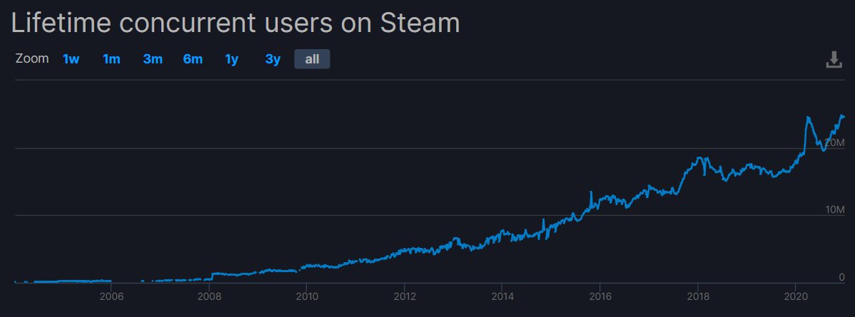 За год пиковый онлайн в магазине вырос почти в полтора раза: 2 января 2020 года в Steam одновременно находилось 17 миллионов игроков. На фоне пандемии магазин значительно нарастил активную аудиторию.